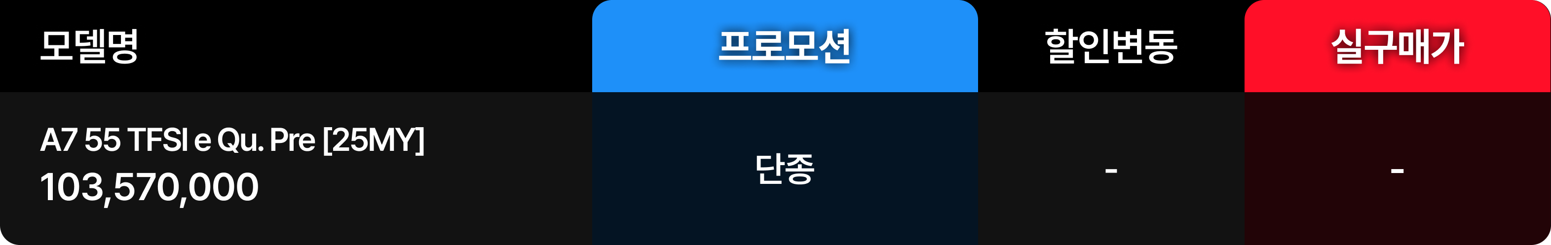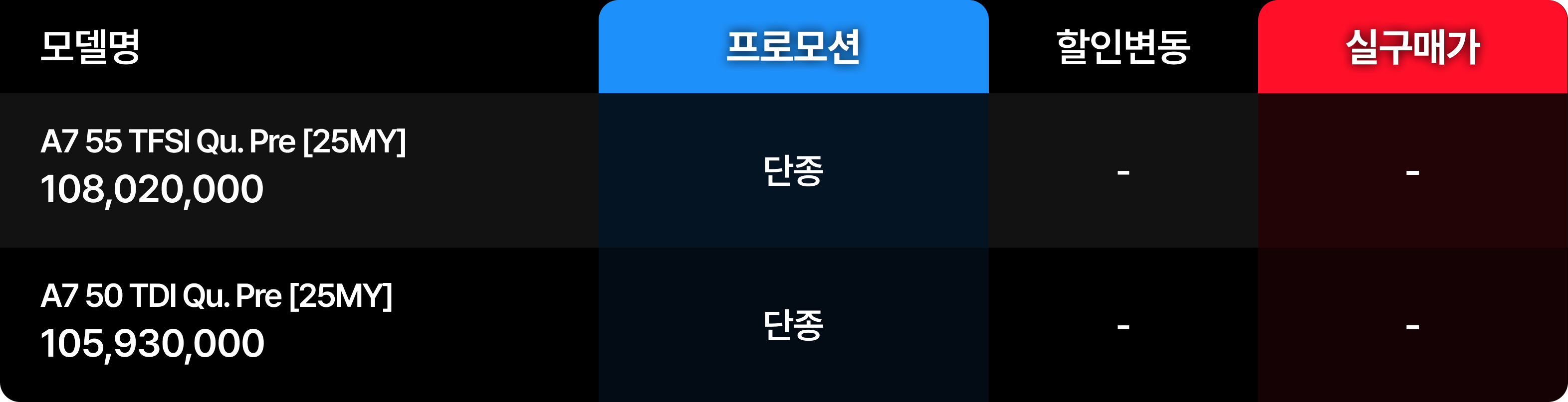 이번 달 데이터에서 가장 주목해야 할 포인트는 아우디 A7 모델의 단종 상태 전환이다. 리스트상에서 55 TFSI와 50 TDI 콰트로 프리미엄 모델 모두 단종으로 명시됨에 따라 신차 시장에서의 공급은 사실상 종료되었다. 아우디의 디자인 철학인 슬로핑 루프 라인을 가장 완벽하게 구현했던 모델의 퇴장은 마니아들에게 큰 아쉬움을 남기고 있다.
