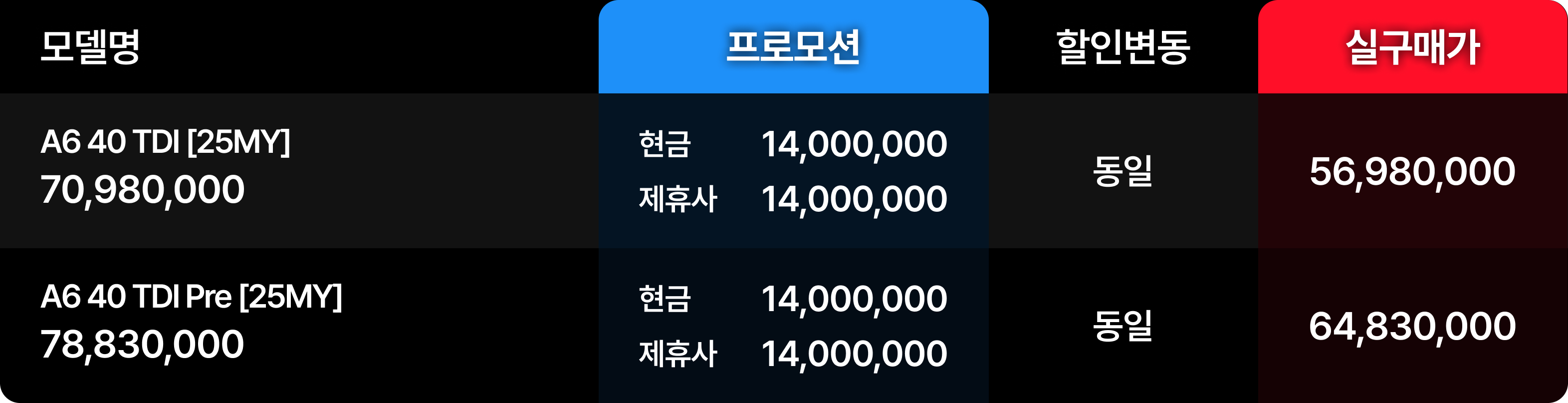 아우디 코리아는 2월 아우디 A6 25년형 전 모델에 대해 전월과 동일한 14,000,000원의 할인 정책을 고수하며 시장 방어에 나섰다.