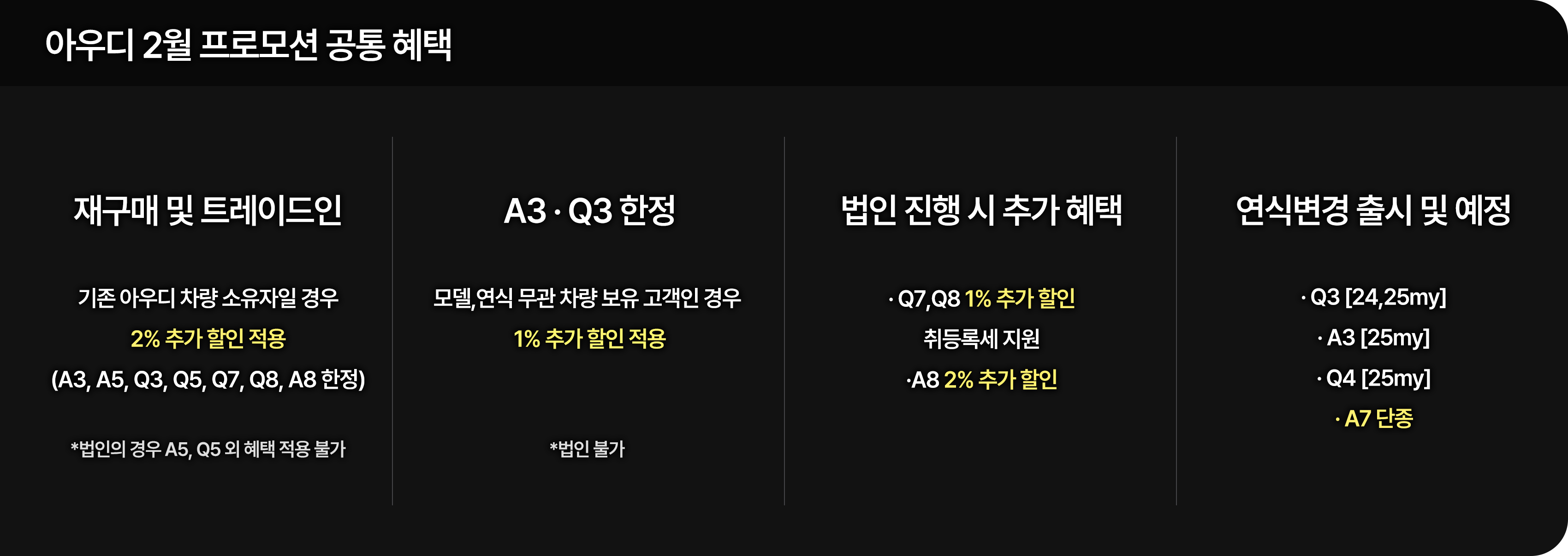 아우디 코리아는 신규 고객 유입 못지않게 기존 오너들의 이탈을 방지하기 위한 로열티 프로그램을 강화하고 있다. 재구매 및 트레이드인 시 제공되는 2% 추가 할인은 아우디 브랜드 내에서의 기변을 유도하는 강력한 장치다. 또한 법인 고객을 대상으로 하는 Q7 및 Q8의 취등록세 지원과 A8의 2% 추가 할인은 법인 물량 확보를 통한 시장 점유율 확대를 목표로 하고 있다.