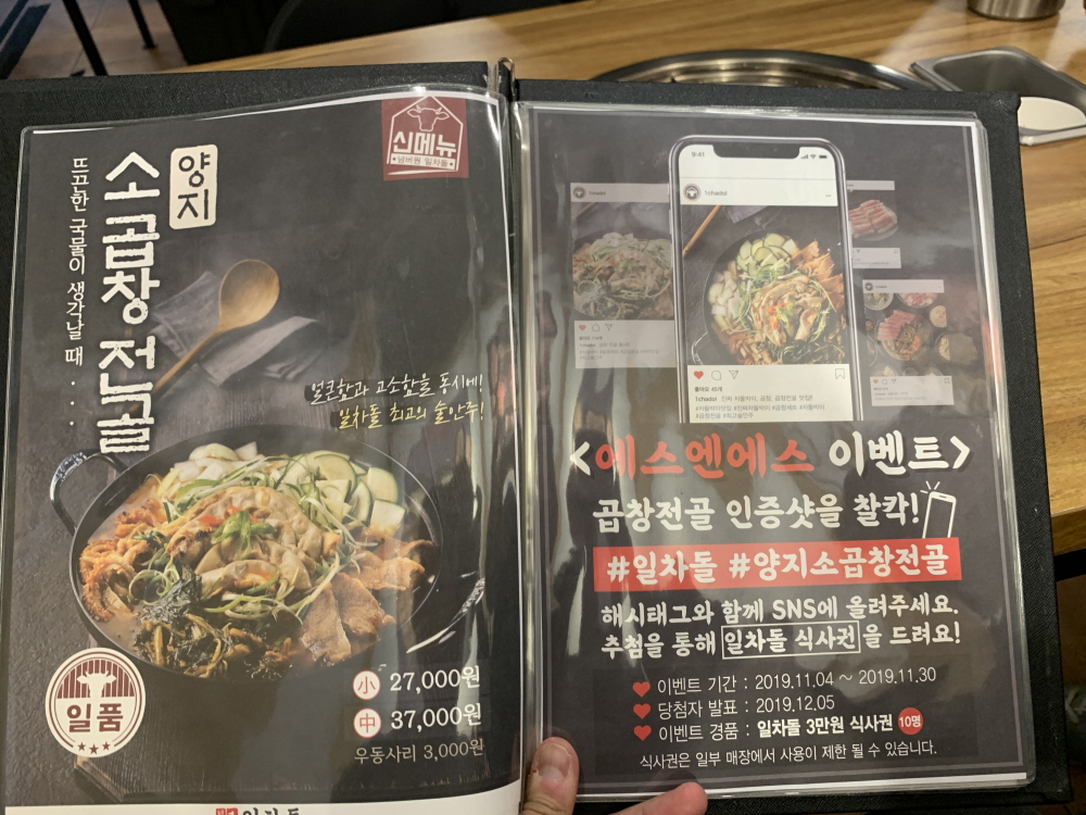 이 곳은 구이로도 유명하지만 소곱창 전골로도 인기가 있는 곳이다. 신메뉴로 새롭게 나왔지만 늦은 밤에 이 곳을 찾는 사람들은 구이보다 곱창 전골을 맛보러 오는 사람도 많이 보이고 있다. 하지만 일차돌이라면 뭐니뭐니해도 이름 그대로 차돌박이가 유명한 곳이다. 하지만 가격적으로 크게 부담이 없는 곳으로 뚝섬 회식하기 좋은 장소로 각광받는 곳이며 이 곳이며 이 곳에 생 삼겹살과 오겹살도 판매 중에 있으며 끝에는 곱창이나 대창도 먹을 수 있다는 장점이 있는 곳이다.