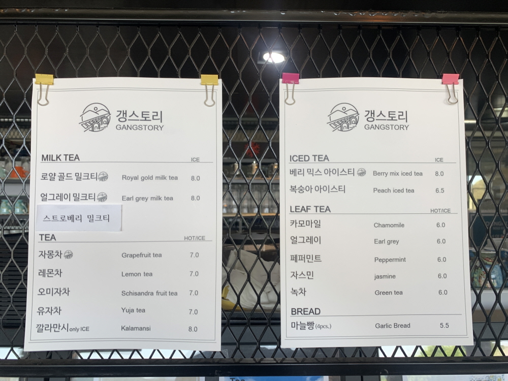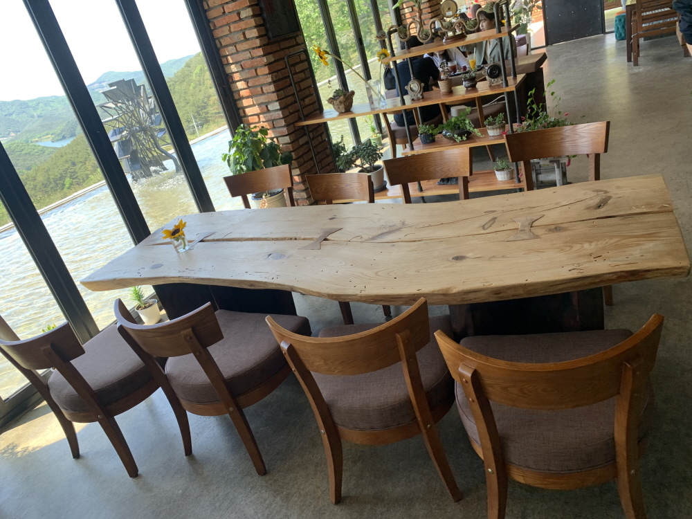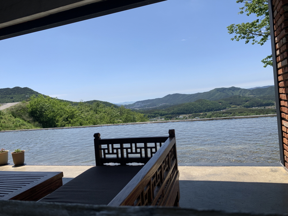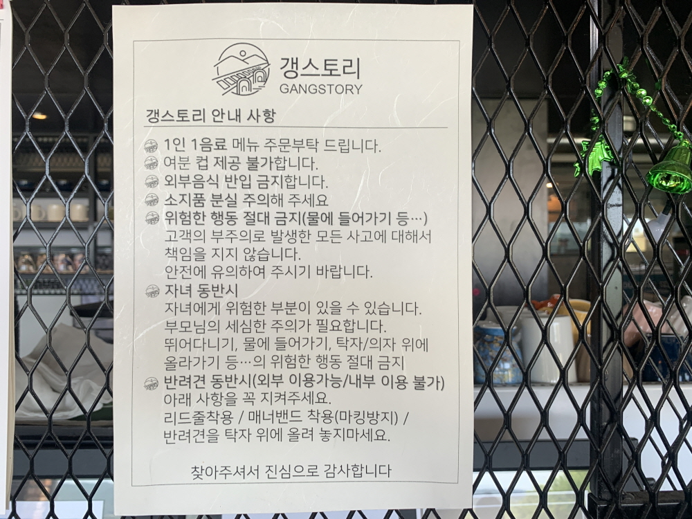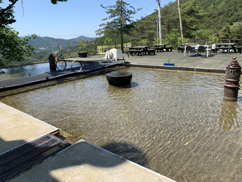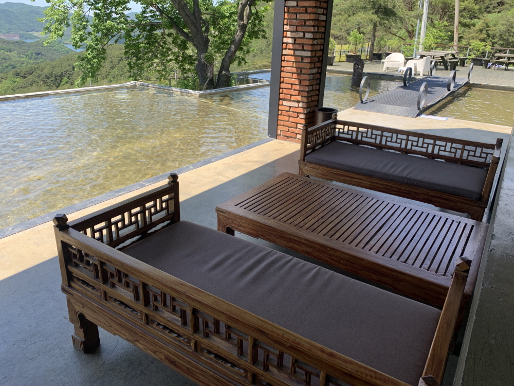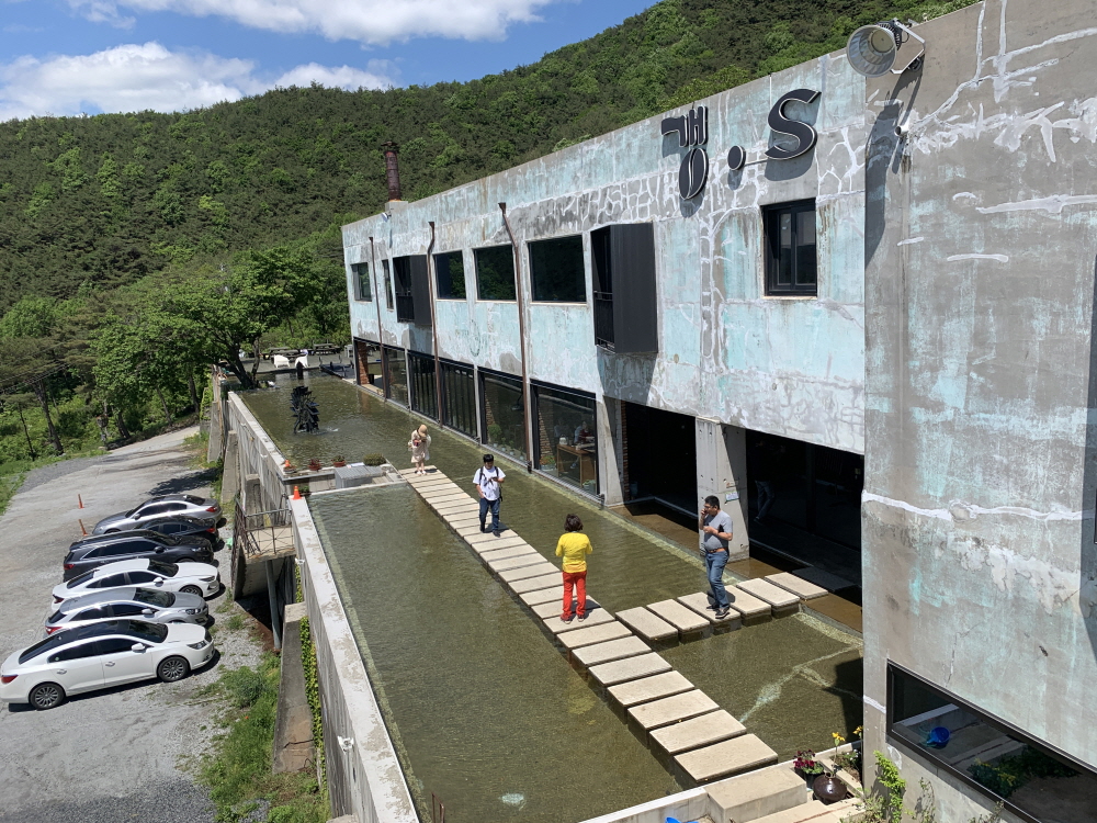 갱스 커피는 개인적으로 실외 테이블에서 커피를 한 잔하는 것을 추천한다. 산 중턱에 위치하고 있어 바람이 살랑 살랑 불어 정말 좋으며 실내와 마찬가지로 실외 테이블도 왕이 앉을 것 같은 테이블부터 캠핑온 느낌의 테이블까지 정말 다양한 테이블이 존재하고 있다. 또한 물에 반사된 햇빛에 셀카를 찍는 것도 이 곳에서 예쁜 사진을 얻는 하나에 팁이다.