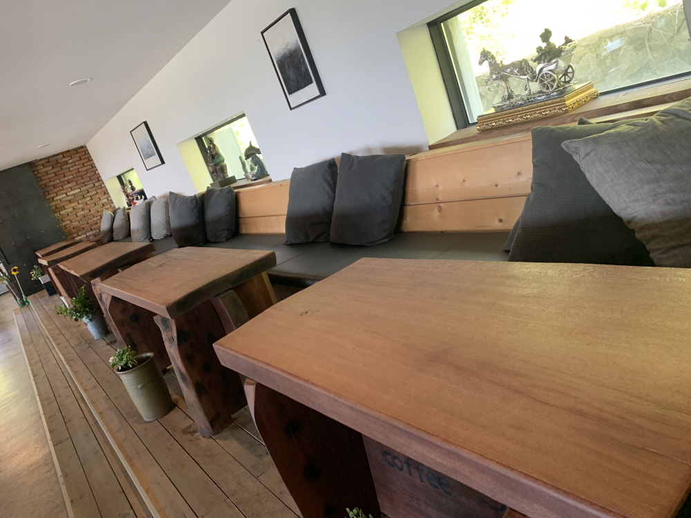 갱스 커피는 개인적으로 실외 테이블에서 커피를 한 잔하는 것을 추천한다. 산 중턱에 위치하고 있어 바람이 살랑 살랑 불어 정말 좋으며 실내와 마찬가지로 실외 테이블도 왕이 앉을 것 같은 테이블부터 캠핑온 느낌의 테이블까지 정말 다양한 테이블이 존재하고 있다. 또한 물에 반사된 햇빛에 셀카를 찍는 것도 이 곳에서 예쁜 사진을 얻는 하나에 팁이다.