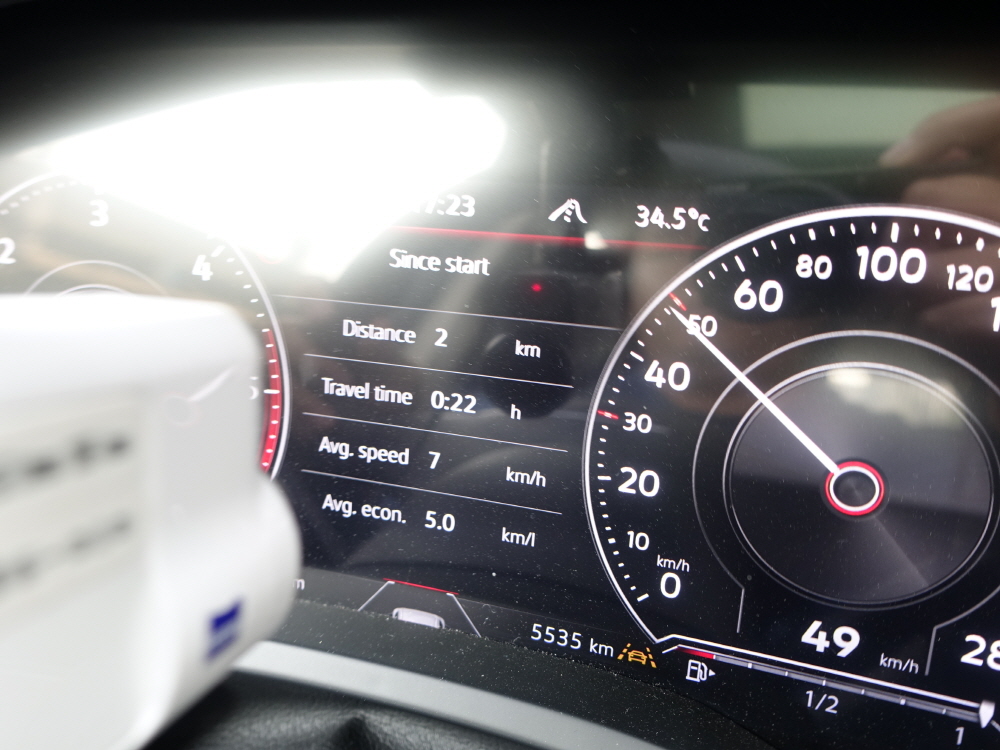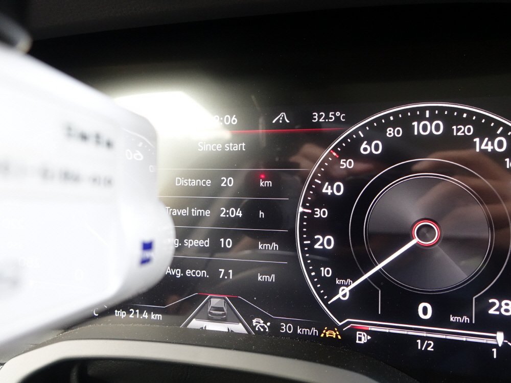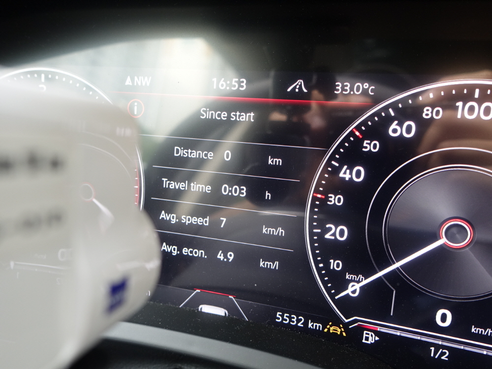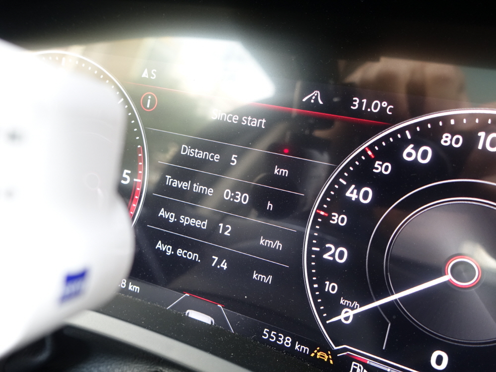 강남 퇴근길 연비는 절대로 좋은 연비가 나올 수 없는 환경이기 때문에 차량 제조사에서 보여주는 공인 연비는 큰 의미가 없다. 투아렉의 공인 복합 연비는 10.3km/L / 공인 시내 연비는 9.5km/L 이지만 총 24.7km/L를 주행하며 2시간 30분이라는 엄청난 시간이 걸리면서 보여준 연비는 7.3km/L로 공인 시내 연비보다는 2.2km/L 낮지만 그래도 2.2톤이 넘는 무게에 3.0 디젤 엔진에서 이정도 연비는 나쁘지 않은 연비를 보여줬다.