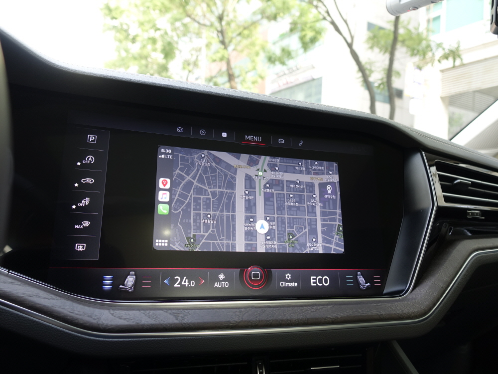 투아렉의 실내에 특징은 많지만 그래도 딱 하나만 선택하라면 바로 15인치 인포테인먼트 시스템이다. 기존 테슬라에서 세로형 17인치 인포테인먼트 시스템이 적용되고 있지만 내연기관 차량에서 15인치 그것도 가로형으로 들어가는 경우는 처음이다. 투아렉에 적용된 인포테인먼트 시스템은 굉장히 단순하면서 최대한 운전자가 편리하게 사용할 수 있게 설계 되어 있으며 손가락을 터치하기 전에 이미 인포테인먼트 시스템은 동작을 감지하는 시스템이 적용되어 있다. 다만 애플 카플레이를 사용할 경우 화면이 가득차지 않는 부분은 살짝 아쉽다.