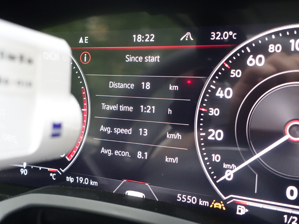 투아렉이 역삼역에 도착했을 때는 18km 주행에 1시간 21분이 소요되었으며 연비는 8.1km/L 였지만 지하철 정거장 2 정거장 밖에 되지 않지만 약 43분이 소요되었으며 연비는 1km/L 밖에 떨어지지 않았다. 2.3km에 43분 소요가 되었지만 약 1km/L 밖에 떨어지지 않았다는 점에서 연비 효율은 꽤 좋은 편이였다.