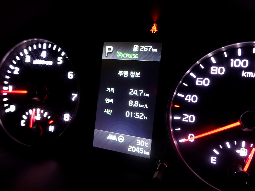 총 주행거리 24.7km의 강남 퇴근길 연비 시승기 결과는 총 주행 시간 1시간 52분이 소요되어 8.8km/L라는 연비를 보여줬다. 공인 시내 연비가 13.5km/L라는 점에서 다소 아쉬운 결과를 보여줬다.