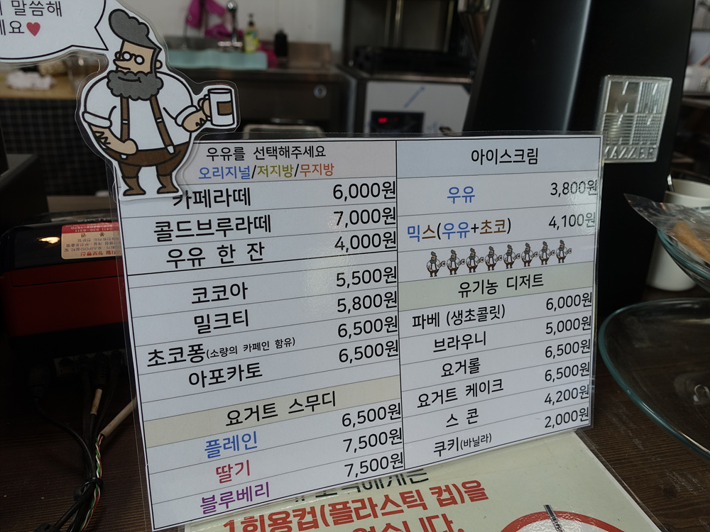 이곳에서는 우유로 만든 다양한 음료를 맛볼 수 있는데 특이한 점은 일반 우유 / 무지방 / 저지방 우유를 선택할 수 있다는 점이다. 특히나 카페라떼나 코코아 등 우유로 만든 제품들이 눈에 띄며 요거트 스무디와 아이스크림까지 이 곳에서 직접 생산된 우유를 맛볼 수가 있다.