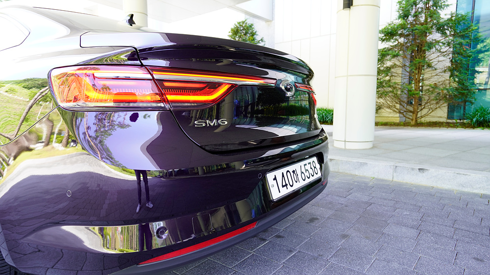 사실 SM6에 관심이 없는 사람이라면 전면 디자인을 살펴보고는 페이스리프트 전 모델인지 아닌지 구분하기가 쉽지 않으며 그마나 리어 디자인에서는 테일램프의 변화로 좀 더 세련된 느낌을 주고 있다. 테일램프는 하나로 이어지는 듯하지만 앰블럼에서 멈추며 크롬라인과 새로운 테일램프 디자인은 아우디와 폭스바겐 아테온이 연상되는 디자인으로 상당히 매력적인 모습을 보여준다.