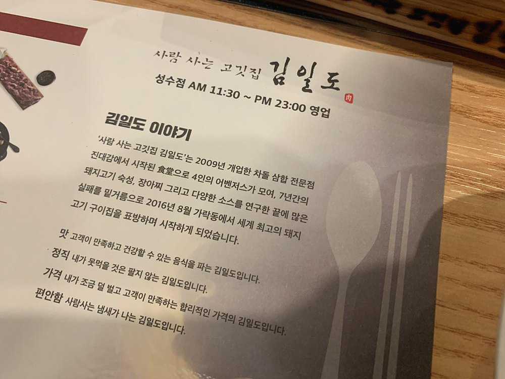 성수동에는 생각보다 삼겹살 맛집이 많은 편이다. 그 중에서도 성수역에서 가까운 사람사는 고깃집 김일도를 방문 해봤다. 고깃집 이름치고는 생각보다 독특한 편이다. 사람 사는 고깃집 김일도라는 이름을 가진 곳으로 2009년 개업한 차돌 삼합 전문점인 진대감에서 시작한 곳으로 7년간 돼지고기 숙성과 짱아찌를 연구하여 2016년 8월 가락동에서 시작한 곳이다. 맛과 정직 그리고 가격과 편안함을 추구하는 곳으로 과연 어떨지 궁금했다.