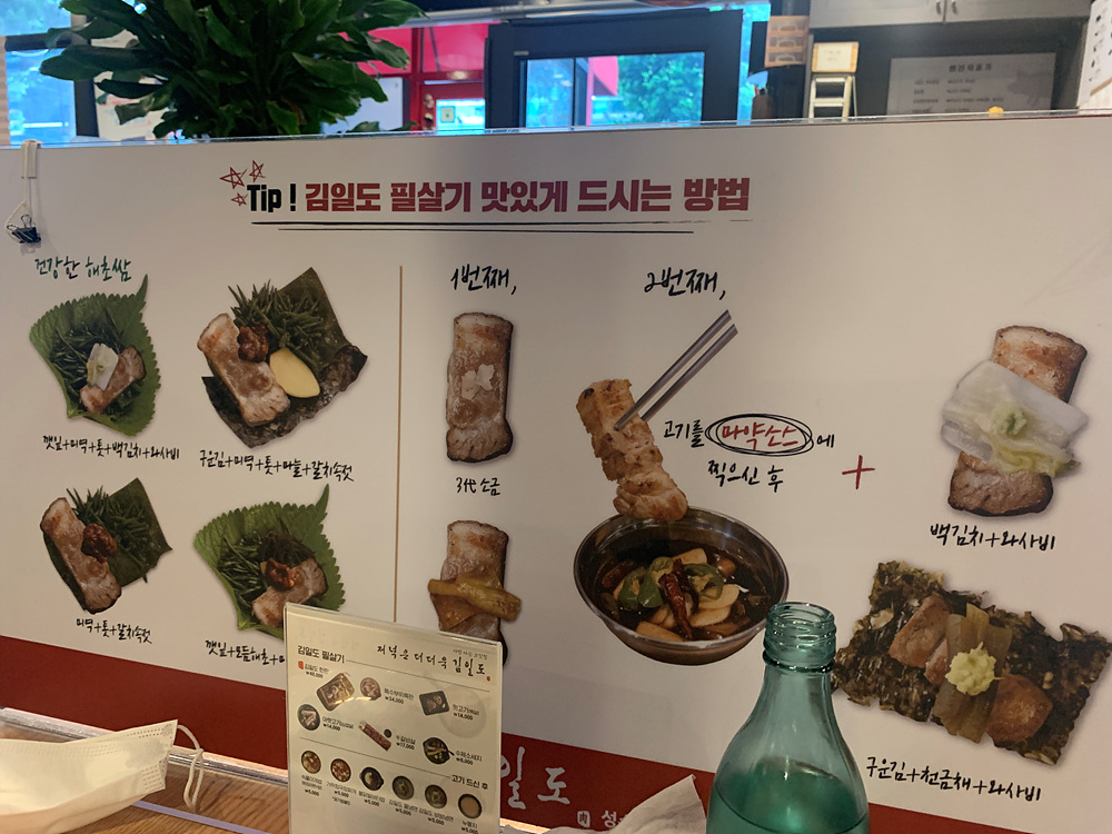 김일도 필수가 맛있게 드시는 방법으로 꽤 다양한 먹는 방법을 소개한다. 대부분 소금 그리고 마약소스와 갈치속젓 백김치 와사비등 삼겹살과 어울리는 조합들을 모두 내놓고 소비자에게 선택해서 먹을 수 있게 해주는 만큼 다른 곳 보다 좀 더 다양한 삼겹살 맛을 느낄 수 있게 하는 곳이다.