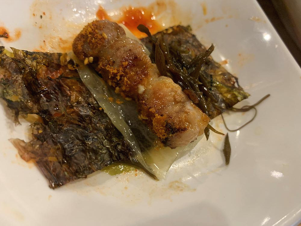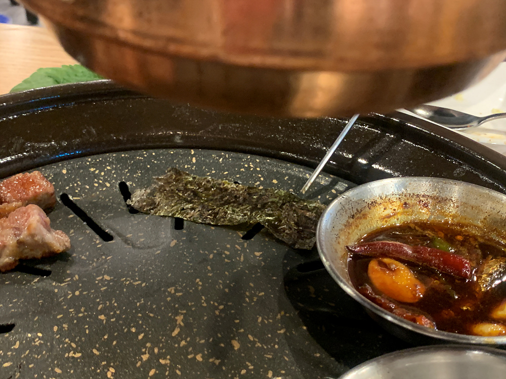 김일도에서 나름 맛있게 먹는 방법은 바로 생 김을 살짝 불판 위에 구워서 한장두고 그 위에 백김치와 해초 그리고 삼겹살에 소스와 와사비를 찍어서 먹는 방법이 개인적으로 가장 맛이 좋았다. 많은 고깃집을 다녀보지만 김을 주는 경우는 흔치 않은데 바삭한 김과 짭짤한 백김치 그리고 씹는 맛이 좋은 해초를 얻어주면 정말 괜찮은 맛을 보여준다.