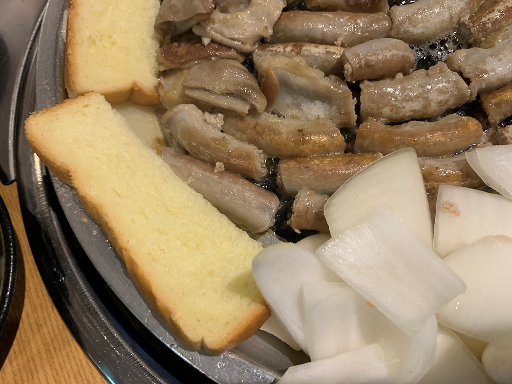 하안돌곱창의 매력은 아마도 옆에 나오는 우삼겹 그리고 곱창 / 막창 / 염통에 조화가 아닌가 싶다. 그 끝으로 기름기를 빨아드리는 식빵은 먹어도 되지만 건강을 위해서 기름만 빨아드리는 용으로 사용하는 것이 좋고 어느정도 곱창을 먹으면 느끼해지는데 빈 공간을 다시 곱창을 넣어서 살짝 익혀서 먹으면 정말 맛좋은 구성으로 맛볼 수가 있다.