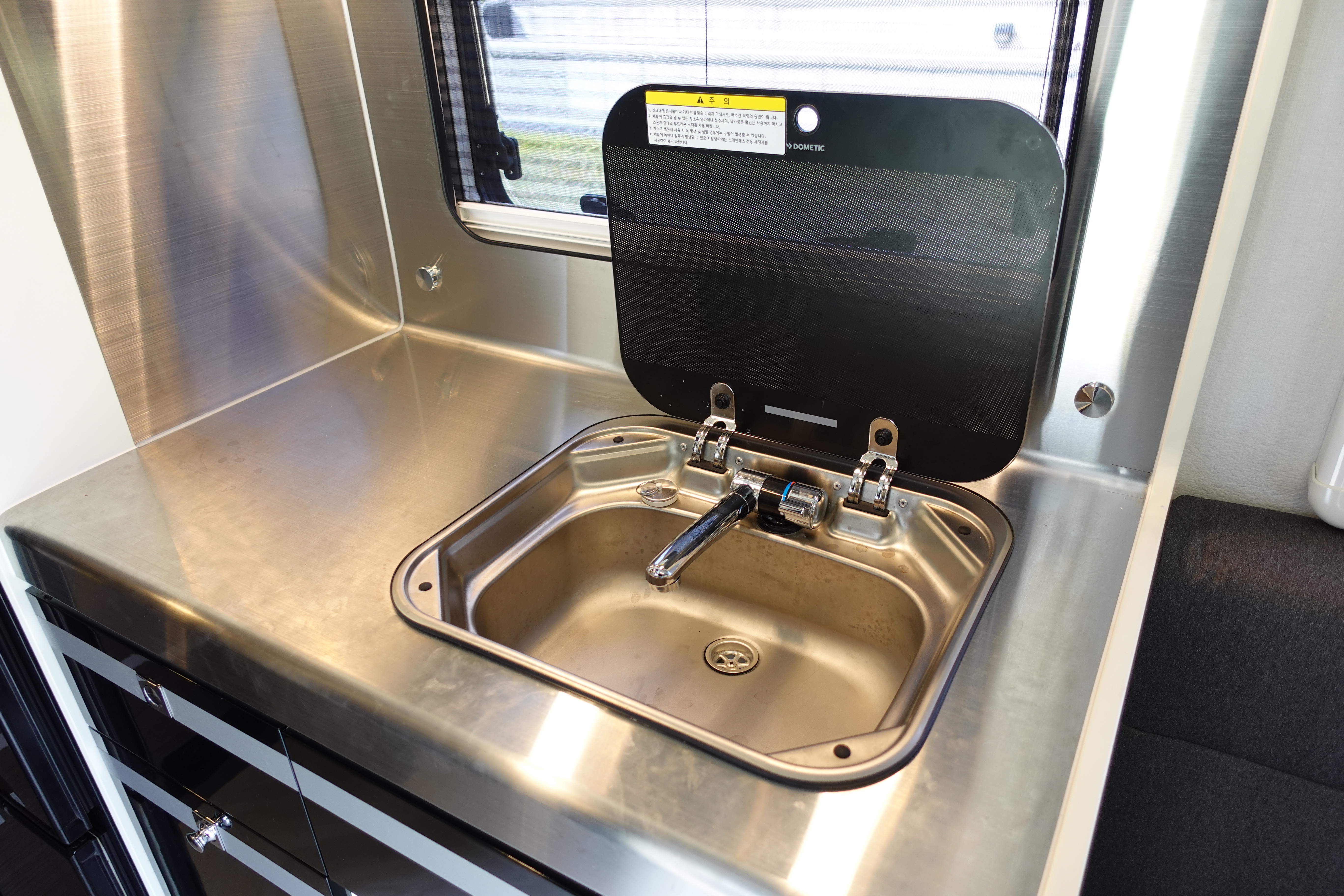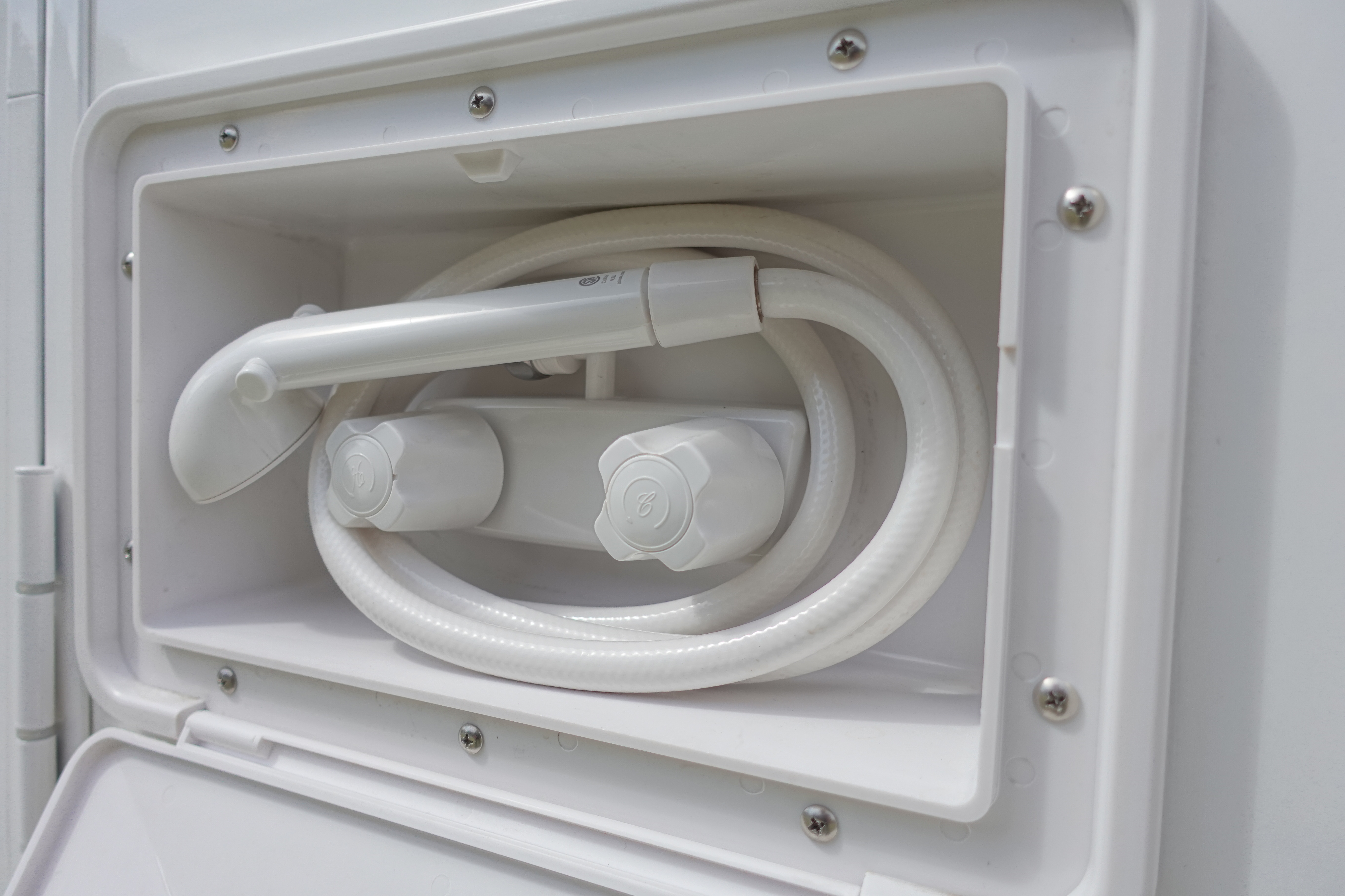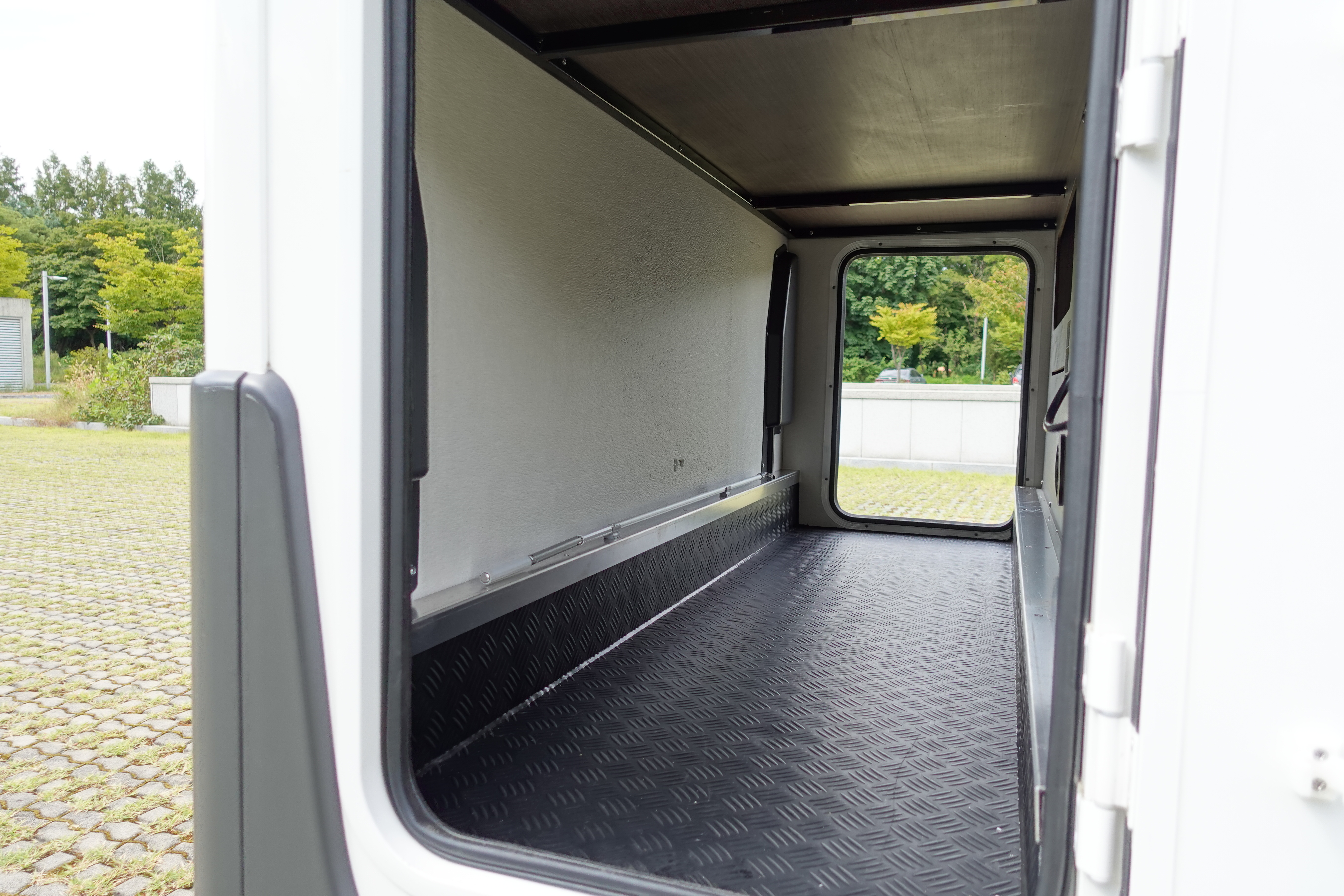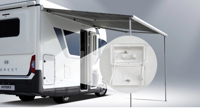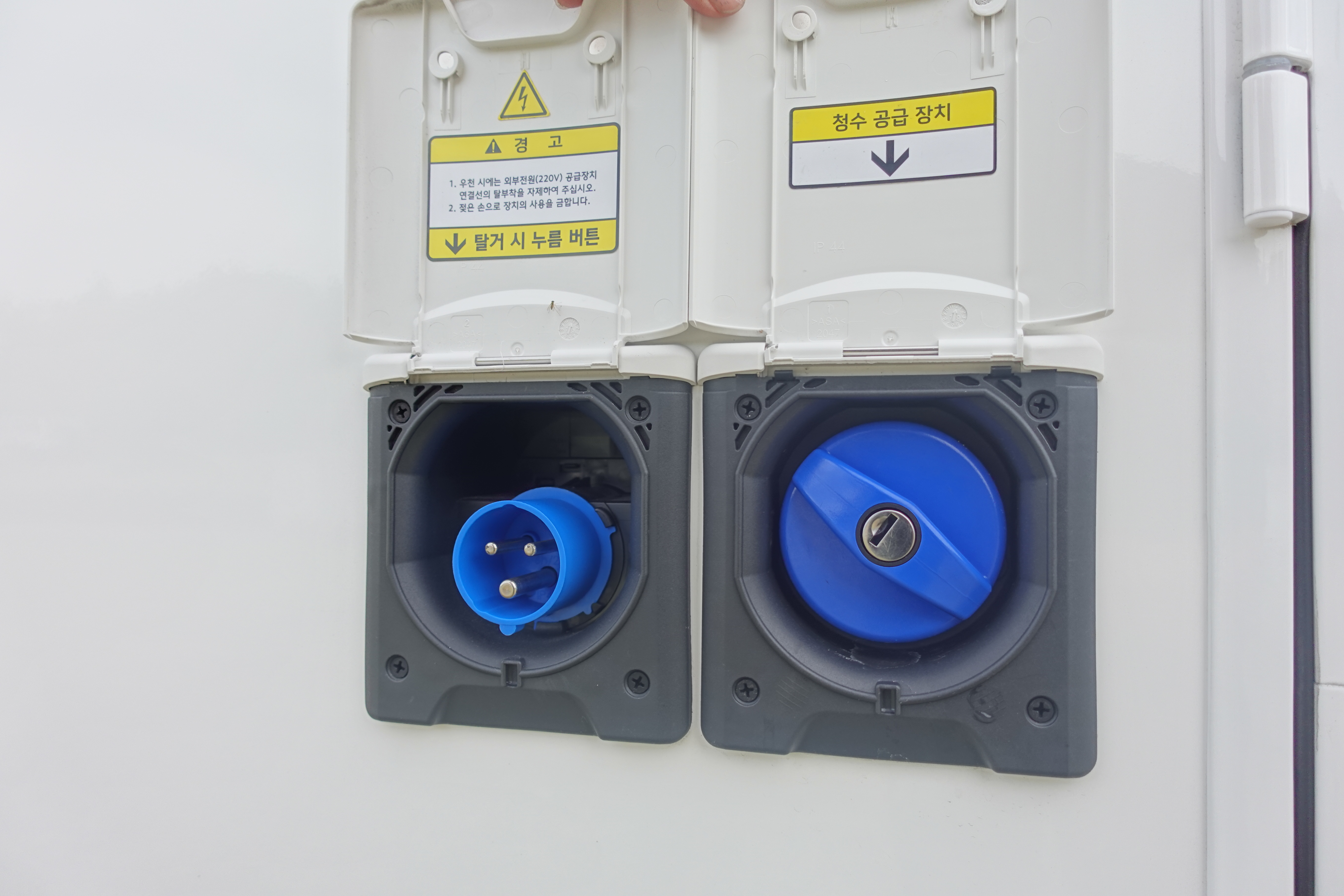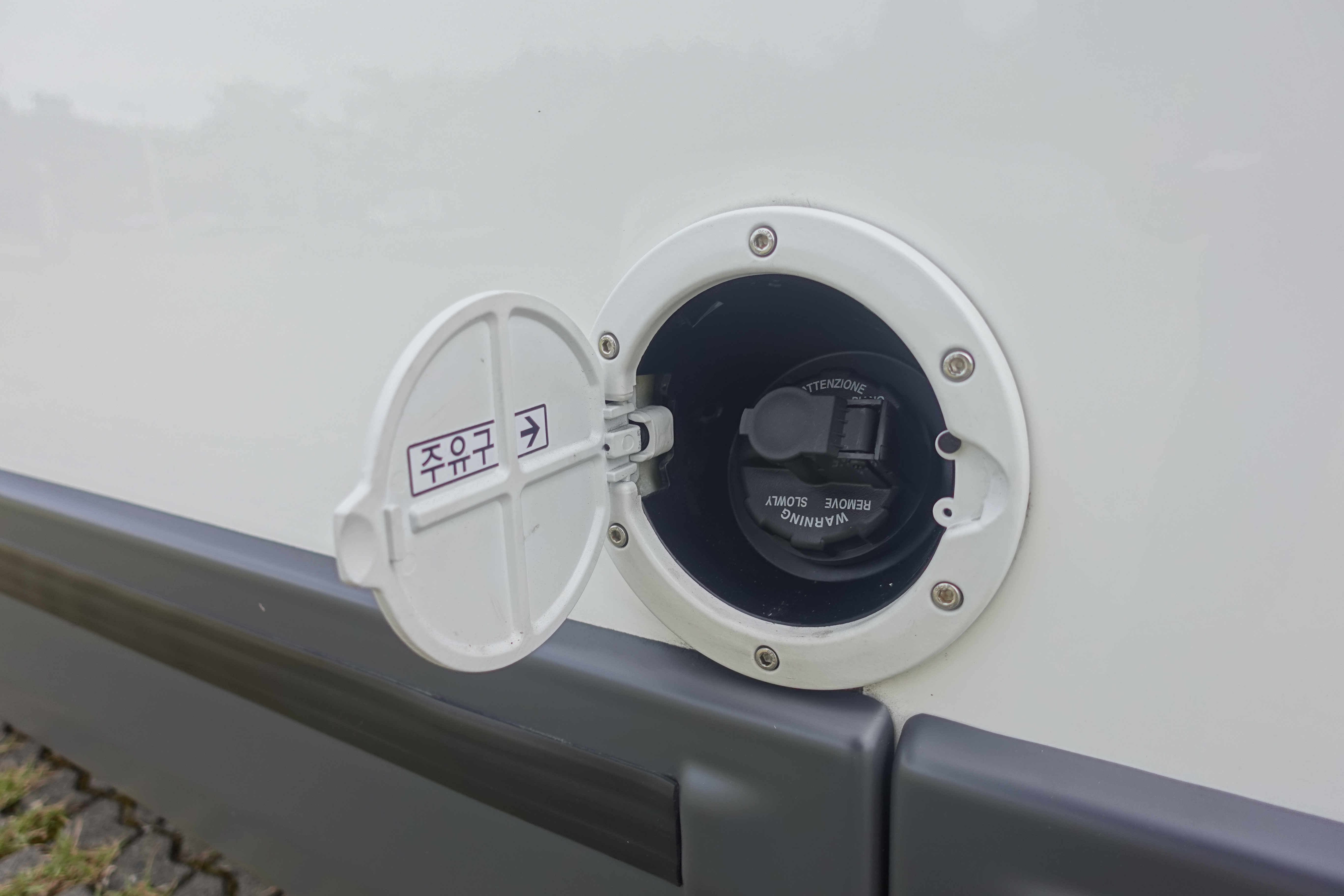 차량 외부에는 주유구 / 요소수 주입구 / 외부 전기 코드와 수돗물을 넣어서 차량 내부에서 샤워시설이나 싱크대를 사용할 수 있는 청수구 그리고 리어 러기지 트렁크와 외부 샤워기 등이 있으며 차량 내부에서 화장실을 이용하면 배설물을 모아주는 하수통은 외부에 장착 되어 있습니다.