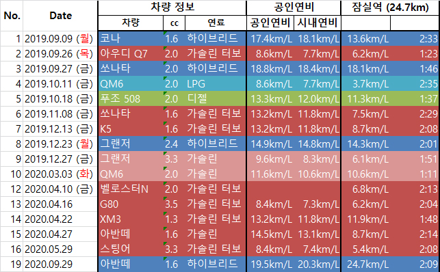 강남 퇴근길 연비 테스트를 진행했던 하이브리드 모델의 연비는 다음과 같다.