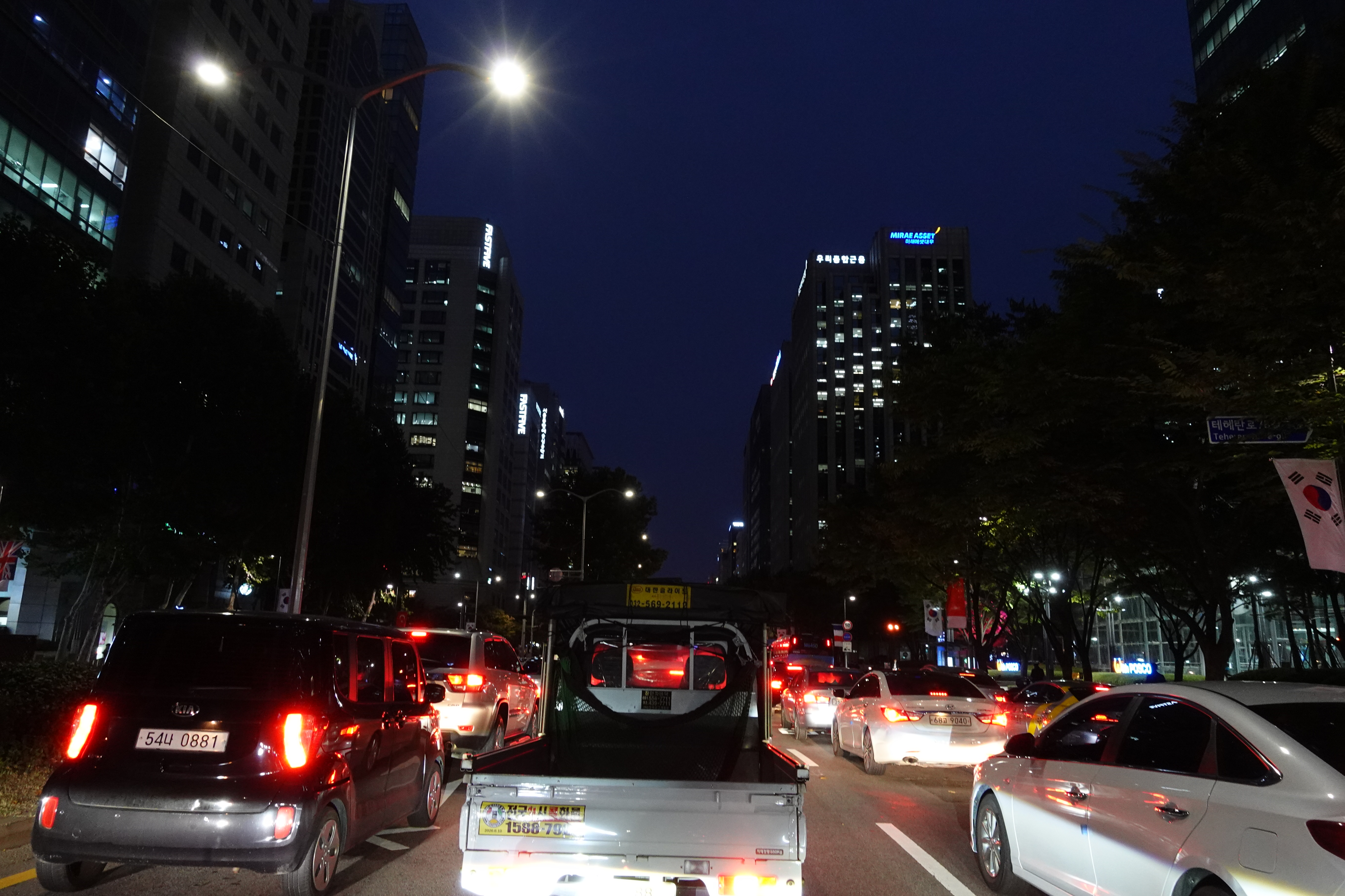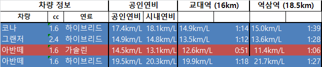 본격적인 강남 초입인 교대역 16km 구간을 진입하였을 때 시간은 1시간 18분으로 코나와 비슷한 시간대를 보여줬는데 코나는 14.9km/L로 연비가 점차적으로 떨어지는 모습을 보여주지만 아반떼는 점점 연비가 향상되어 20km/L대에 육박하는 연비를 보여줬다. 이 구간까지 사실 가솔린 모델과 큰 차이가 없었지만 가장 많이 막히는 구간인 역삼역 18.5km 구간에서 삼성역까지 20.8km 구간인 2.3km 구간은 가장 많이 막힐때 2.3km 주행하는데 1시간도 더 걸리는 구간이다.