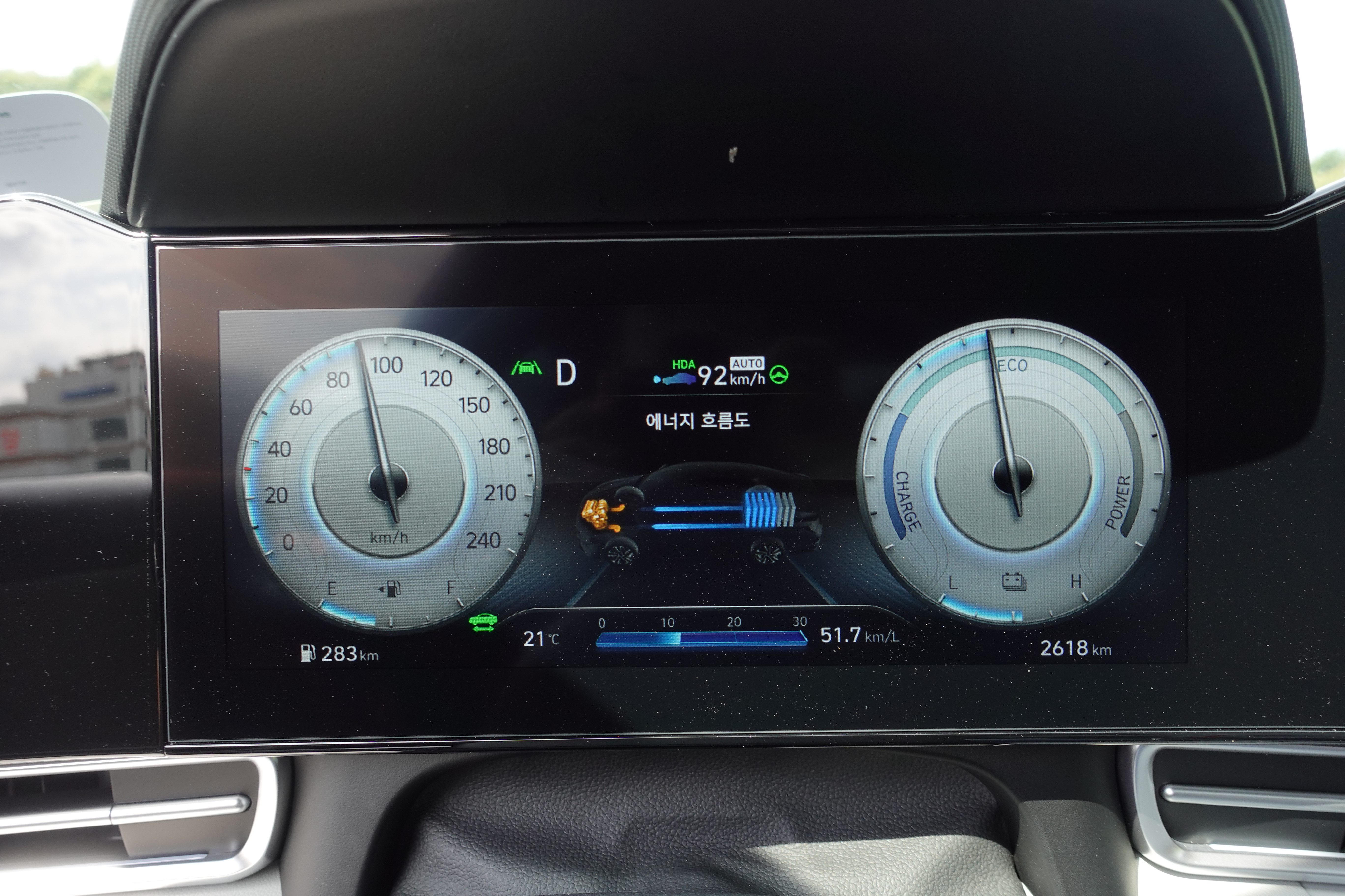 특히나 고속도로에서 보여주는 어댑티브 크루즈 컨트롤 기술인 HDA (Highway Driving Assist) 기술은 아반떼 하이브리드가 최적의 연비를 위하여 능동적으로 시속 5~8km/h를 조정하는 것을 볼 수가 있었다.