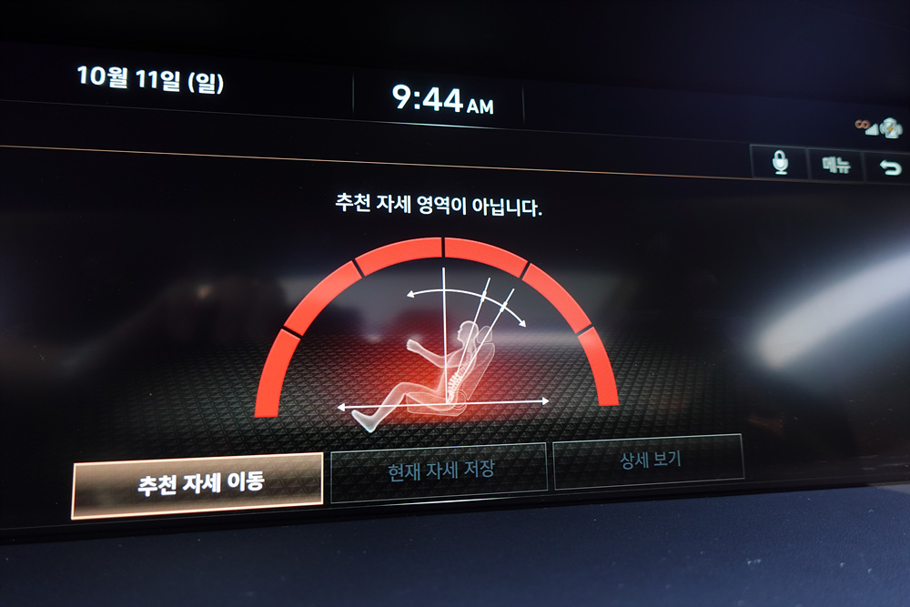 제네시스 G90 모델에 적용된 추천 자세 기능은 운전자의 신체조건을 입력하면 운전에 가장 좋은 추천 자세로 이동한다. 물론 운전 성향에 따라서 자세가 불편하게 느낄 수가 있지만 장시간 운전을 하고 내려오고 난 뒤 찾은 기능으로 장 시간 운전 후 허리가 아팠던 사람들이라면 내가 맞는 자세로 운전하는지를 자동차에게 물어볼 수 있는 기능이다.