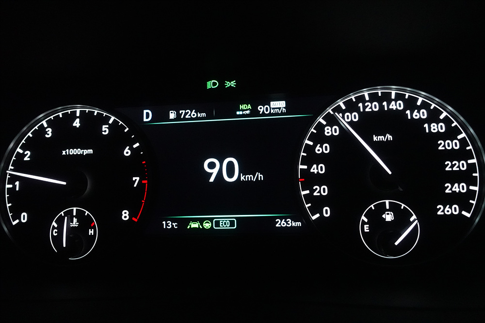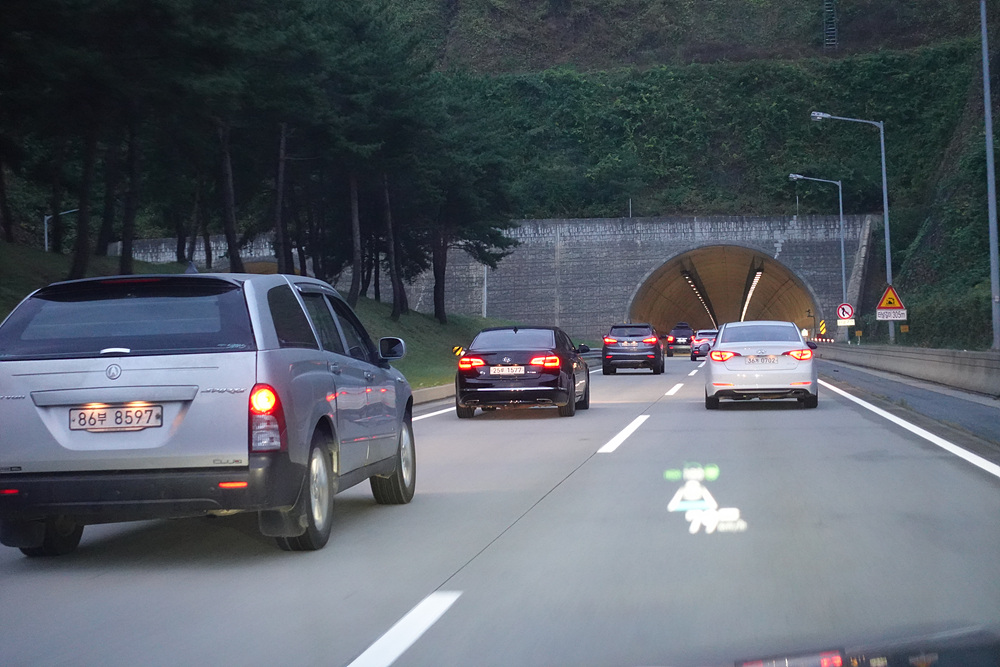 새벽 시간대에 차량도 거의 없고해서 어댑티브 크루즈 컨트롤 기술인 HDA (Highway Driving Assist) 기능을 사용하고 주행하기 시작했다. 최근 현대자동차의 HDA 기술은 고속도로 뿐만 아니라 자동차 전용도로에서 사용되는 HDA II 기능이 탑재되어 있지만 아쉽지만 제네시스 G90 모델에는 HDA I 이 적용되어 있어 고속도로에서만 HDA 기능이 적용된다.