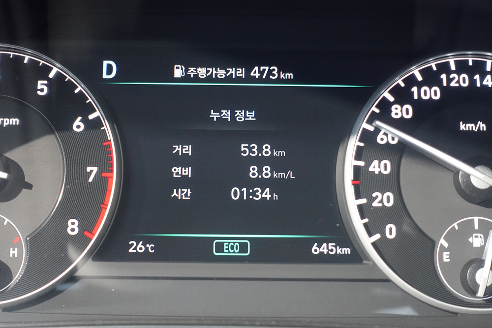 330km를 주행한 이후 시내 주행하면서 느낀 점은 고속도로 뿐만 아니라 시내에서도 굉장히 편하다는 점이다. 전장 길이 5,205mm로 항상 작은 차량만 주행했던 사람이라면 분명 회전각이 조금 더 넓게 느껴지지만 전/후방 센서와 어라운드 뷰 카메라로 크게 어렵지 않게 주차를 할 수가 있다. 또한 오토홀드와 엔진스탑 기능은 다른 현대자동차 모델보다 좀 더 부드럽게 그리고 좀 조용하게 작동하려고 노력한 흔적이 보인다.