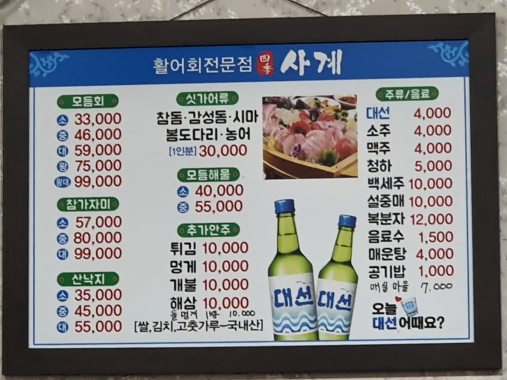 전체적으로 가격은 나쁘지 않은 편이다. 싯가 어류를 1인분에 3만 원에 먹을 수도 있고 모듬회는 4인 기준으로 왕짜리나 왕대짜리 하나를 먹으면 딱 좋은 정도이다. 성인 남성 4명 기준으로 충분한 느낌을 가지고 있으며 모듬해물이나 추가 안주도 함께 먹을 수 있어 가성비가 좋다.