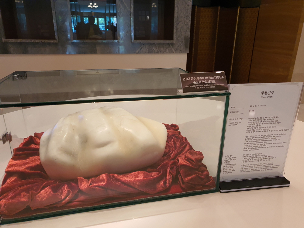 농심호텔에 자랑거리는 호텔 로비에서 만나볼 수 있는 대형진주이다. 가로 40cm / 세로 25cm / 높이 20cm의 거대한 진주는 그 무게만 하더라도 25kg라는 엄청난 크기를 가지고 있다. 진주는 옛부터 바다에서 발견된 보석으로 건강과 장수를 상징하는데 6월달 탄생석으로 살아있는 보석이라고 불리우기도 하다. 대략적으로 25kg의 진주가 만들어지려면 바닷속에서 만년 이상 자라야 23kg정도가 된다고 한다. 때문에 역사에서 볼법한 진주는 BC 3천 5백년 전부터 지금까지 변함없이 가치를 보존해온 보석이라고 할 수 있다.