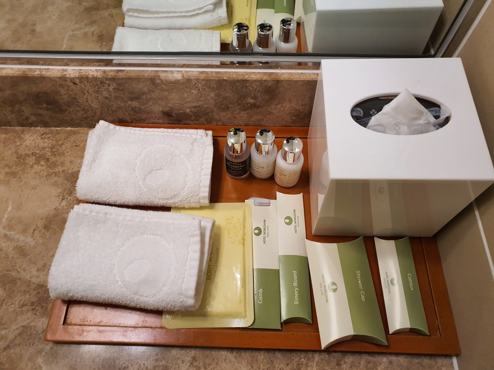 호텔 어미니티는 그럭저럭인 편이다. 여기에 기본적으로 제공되는 샤워캡이나 빗 그리고 타월들이 마련되어 있다. 호텔이라 그런기 기본 칫솔은 없으니 개인적으로 준비해서 와야한다. 만약에 없다면 호텔 앞 편의점에서 판매하니 참고하면 좋을듯하다.