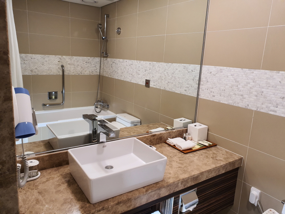 욕실 및 화장실은 깔끔하면서 객실 인테리어와 잘 어울리는 듯한 느낌을 가지고 있다. 청소 상태는 괜찮은 편이며 습기나 전체적인 기능 또한 크게 부족함은 없어보인다. 기본적인 욕조와 샤워시설 그리고 화장실이 구성되어 있으며 헤어드라이기는 기본적으로 제공되고 있다.