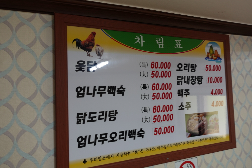 밤나무집은 옻닭이 메인 메뉴이지만 옻닭을 최근에 즐기는 사람들이 많이 없기 때문에 아주 매니아층이 즐기는 음식은 아니다. 특히나 엄나무 백숙과 닭도리탕 그리고 엄나무 오리백숙, 오리탕 등 다양한 음식들이 존재하지만 가장 기본적인 음식인 닭도리탕은 5~6만 원정도의 가격을 가지고 있다.