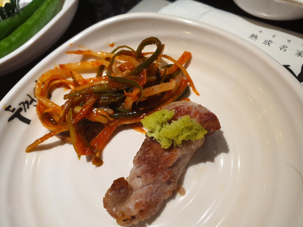기본 3가지 소스와 삼겹살과 함께 먹으면 좋은 마늘 / 양파 / 고추냉이 등 사실 기본적으로 사람들이 좋아하는 코드를 모두 갖췄다. 또한 지하에 위치하고 있지만 불판에서 냄새와 연기를 흡수하는 시스템을 갖추고 있기 때문에 삼겹살을 굽는 곳이라고 하기에는 굉장히 럭셔리하고 냄새도 거의 나지 않는 점이 정장을 입고 출근하는 여의도 사람들에게 제격이다.