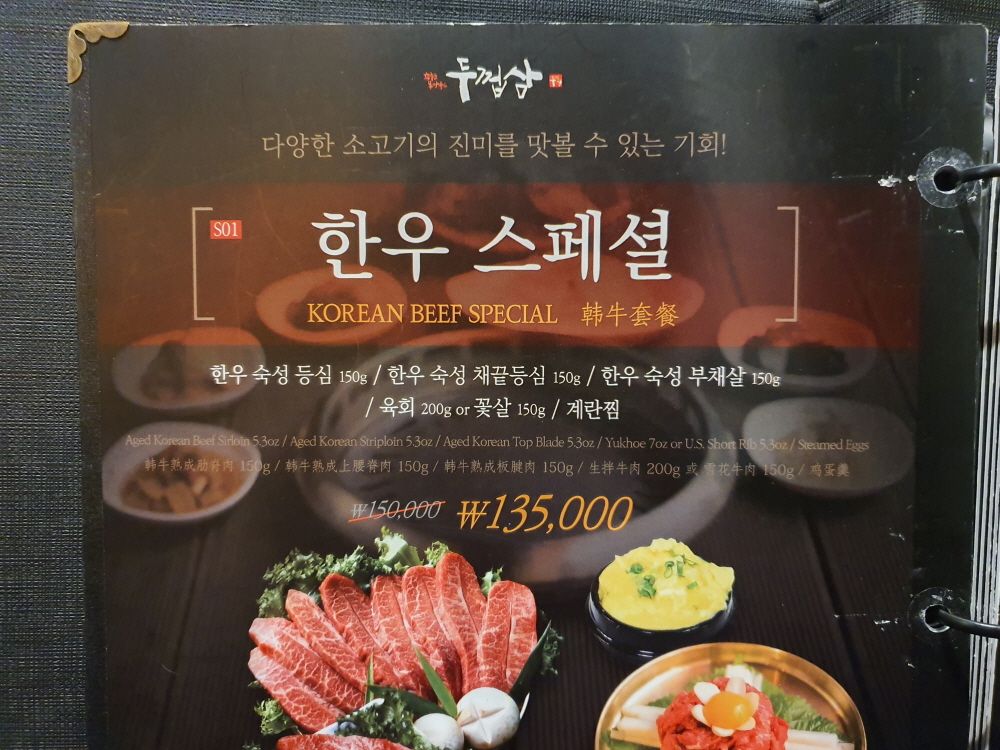 여의도에 위치한 두껍삼의 가격은 삼겹살 기준 18,000원 정도한다. 이곳이 삼겹살 전문점이라고 하지만 한우도 꽤 괜찮은 구성과 맛으로 판매되고 있어 많은 판매를 보여주고 있으며 기본적으로 삼겹살로 시작해서 한우로 마무리하는 경우도 많다.