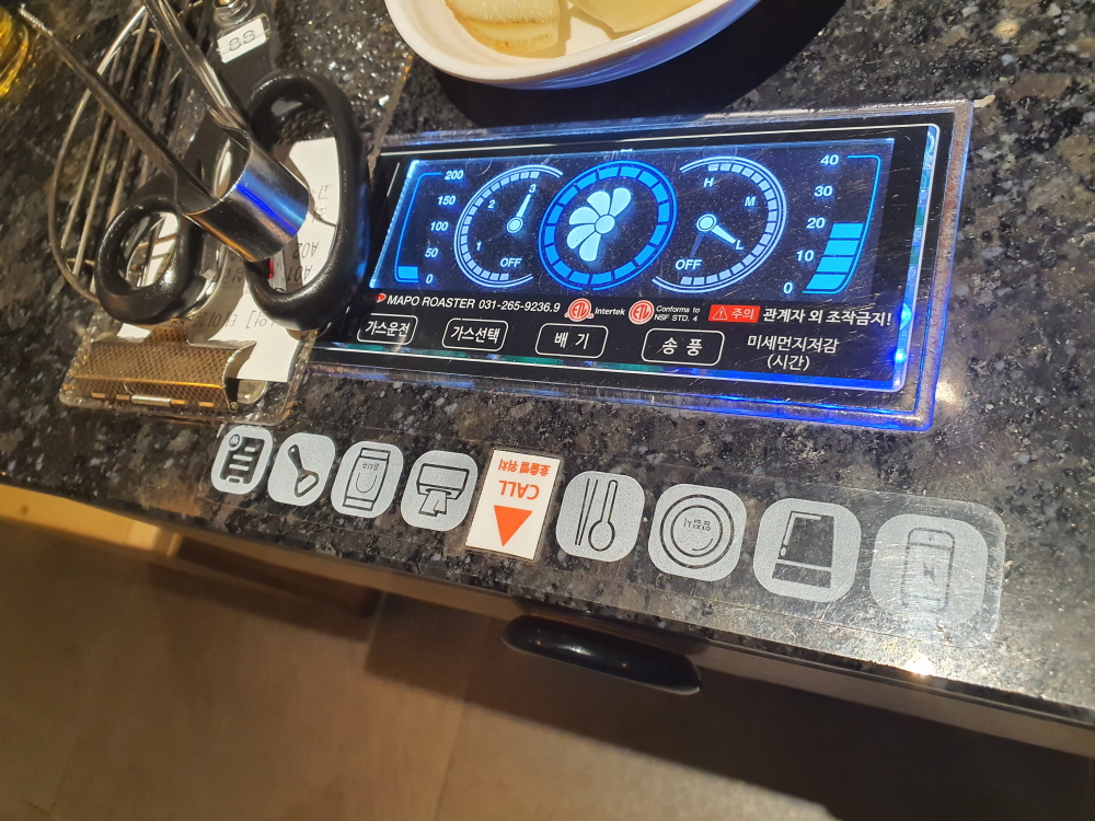 처음 불판에 불이 달궈지면서 이 곳에서 일하는 직원 분들은 레이저 온도계로 불판에 온도를 계속 체크한다. 이렇게 불판에 온도가 올라왔을 때 고기를 올려두고 타이머를 맞춰서 정확한 타임에 고기를 뒤집고 자르며 어떤 사람이 굽더라도 언제 오더라도 항상 같은 맛을 느낄 수 있는 것이 가장 큰 특징이다.