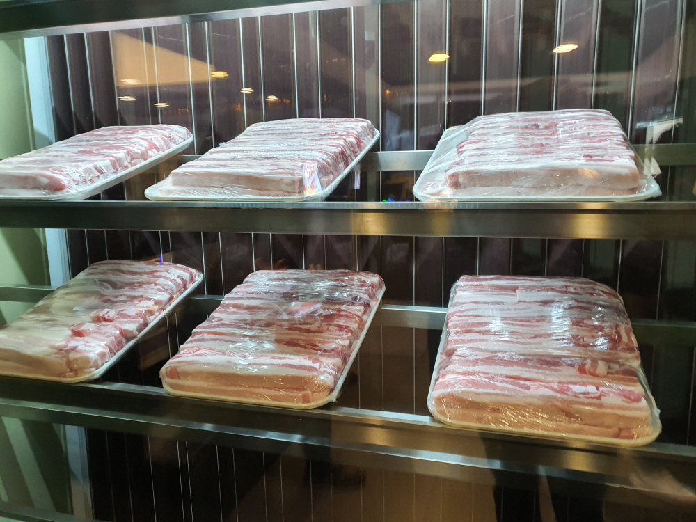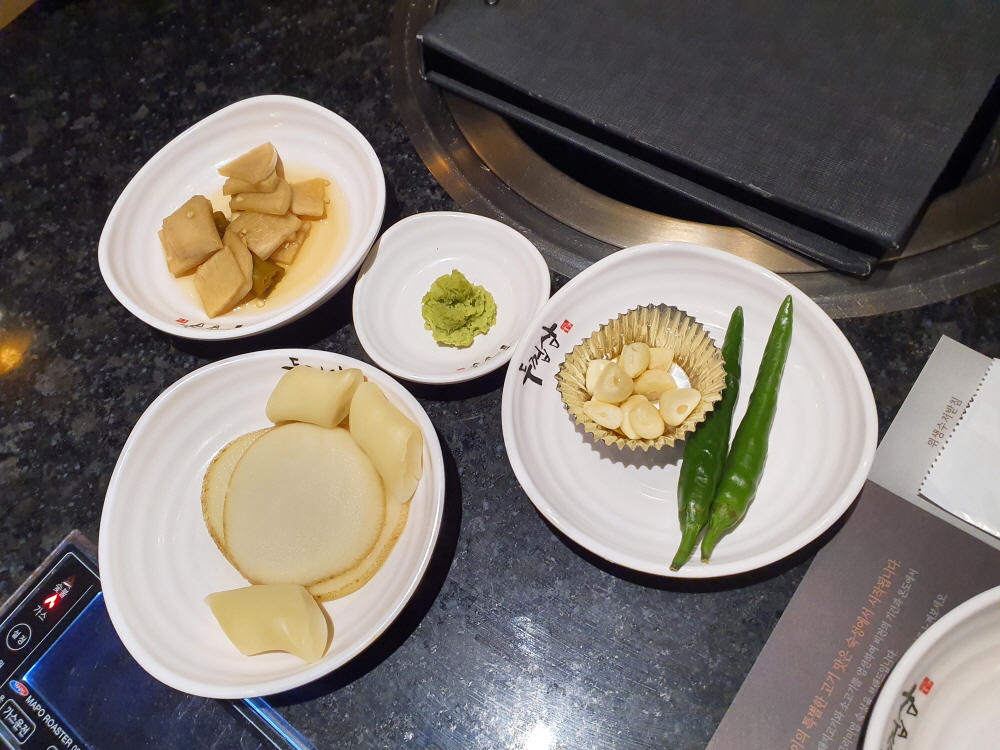 기본 3가지 소스와 삼겹살과 함께 먹으면 좋은 마늘 / 양파 / 고추냉이 등 사실 기본적으로 사람들이 좋아하는 코드를 모두 갖췄다. 또한 지하에 위치하고 있지만 불판에서 냄새와 연기를 흡수하는 시스템을 갖추고 있기 때문에 삼겹살을 굽는 곳이라고 하기에는 굉장히 럭셔리하고 냄새도 거의 나지 않는 점이 정장을 입고 출근하는 여의도 사람들에게 제격이다.