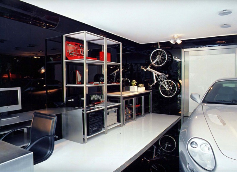 게러지 안 쪽은 차량 1대가 주차될 수 있는 공간을 가지고 있으며 차량을 수리할 수 있는 공구와 타이어 그리고 취미 활동을 할 수 있는 공간으로 구성되어 있ㅇ다. 양쪽을 대칭으로 이루어지고 있는 만큼 꽤 매력적인 모습을 보여주고 있다.