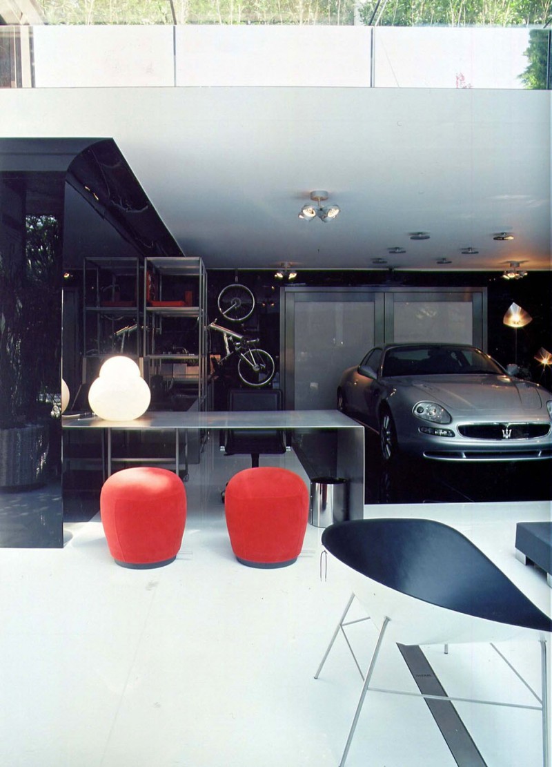 보통은 유리로 미닫이 문으로 구성되어 있지만 이 곳은 위로 열리는 타입의 출입구를 보여주고 있다. 처음에는 집 안에 차량이 오가는 문으로 생각했지만 차량이 들어오는 문은 따로 위치하고 있으며 사람을 위한 도어로 구성되어 있다. 또 다른 가지 특이한 점은 브라질 날씨 특성상 태양이 뜨거운데 이렇게 통유리로 구성되어 있으면 실내 온도가 덥지 않을까? 라는 점이다. 물론 이 공간은 하우스라기보다는 게러지에 가까운 공간으로 취미 생활을 위한 공간으로 보여진다.
