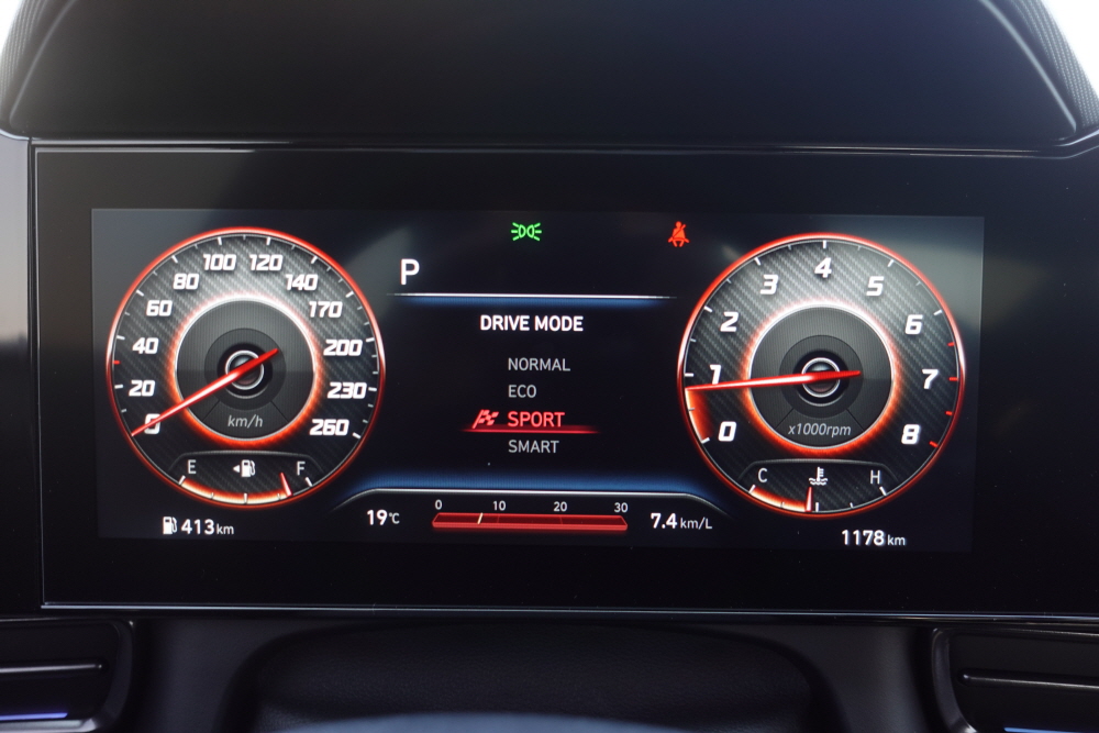스티어링 휠과 기어 노브에는 빨간색 스티치로 N Line에 포인트를 주고 있으며 작은 N 로고 또한 감성 마력을 높혀주고 있다. 다만 계기판은 일반 아반떼와 큰 차별성이 없으며 드라이빙 모드 또한 노멀 / 에코 / 스포츠 / 스마트 총 4가지로 스포츠 플러스 모드와 같은 기능은 없는 것이 특징이다.