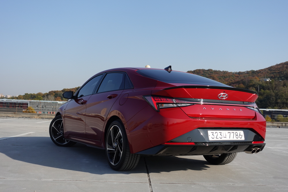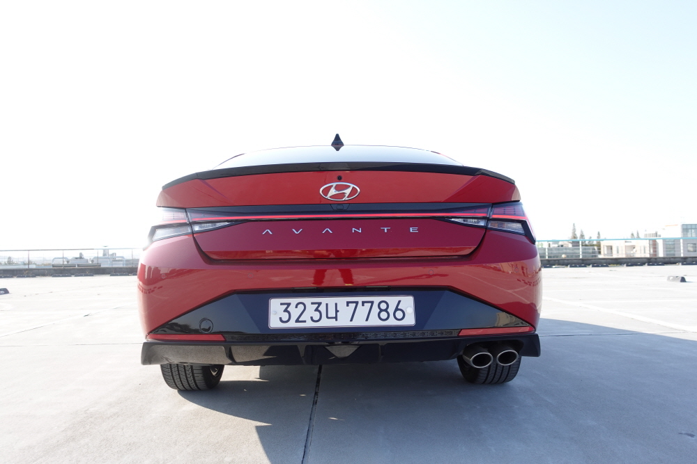 N Line의 리어 디자인은 N이 채워야하는 공백을 살짝 남겨 놓은 느낌이다. 이미 티저 이미지로 공개된 아반떼 N 모델에는 듀얼 머플러가 적용되지만 아반데 N 라인은 듀얼팁 싱글라인 머플러가 자리 잡고 있는 것이 특징이며 N Line 모델에 배기 사운드는 벨로스터N에서 보여줬던 일명 팝콘 소리는 들리지 않는다.