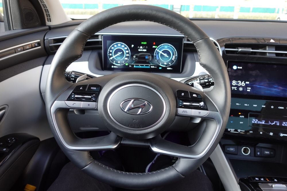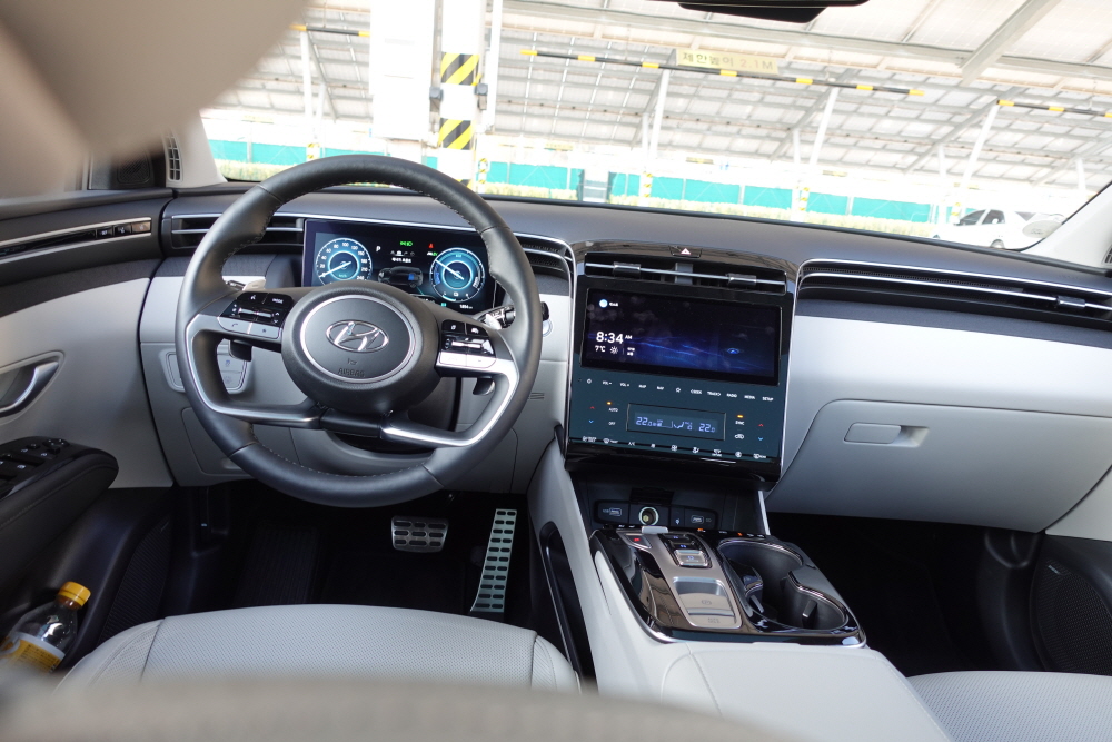 하이브리드 모델이지만 스티어링 휠은 굉장히 스포티한 느낌을 보여주고 있습니다. 이뿐만이 아니라 하이브리드 모델은 연비를 생각하면서 회생제동 쉬프트로 사용되는 경우가 많지만 투싼 하이브리드 모델은 자동 6단 변속기를 주행 중 자유자재로 변속할 수가 있습니다.