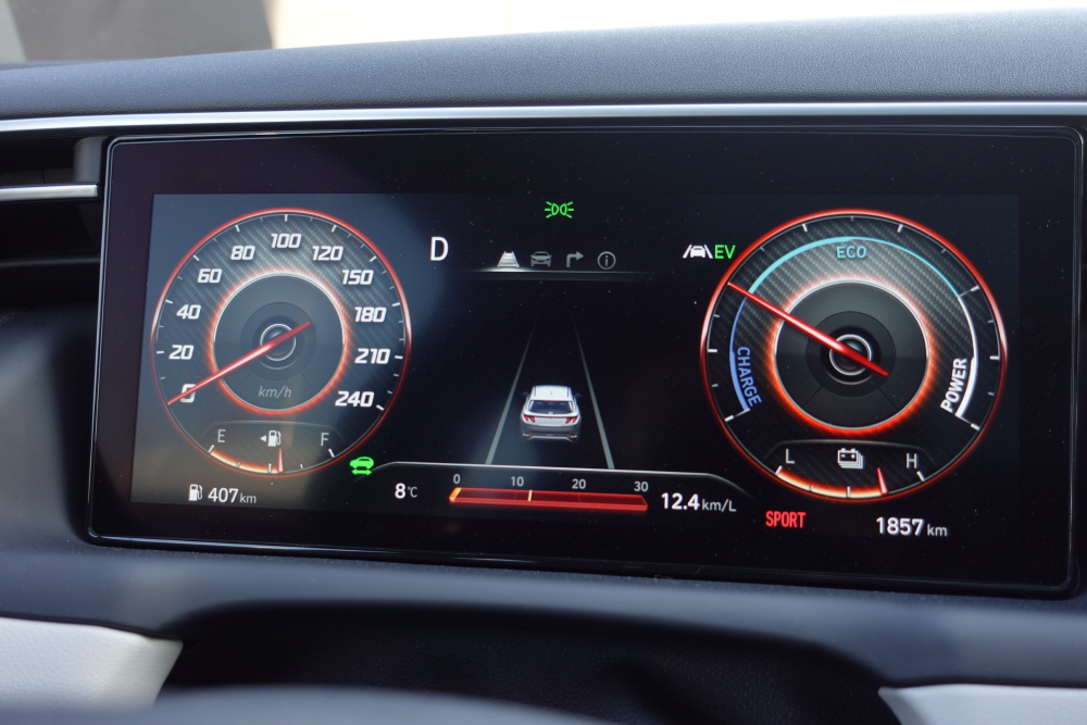 투싼 하이브리드는 1,598cc의 가솔린 싱글 터보 엔진과 전기 모터를 사용하고 있어 최고출력 180마력에 최대토크 27.0kg.m의 출력을 보여주고 전기 구동모터는 최고출력 44.2kW, 최대토크 44.2Nm을 보여주고 있습니다. 여기에 복합연비 16.2km/L로 꽤 좋은 연비를 보여주고 있습니다. 예전에는 가솔린 자연흡기 엔진에 전기 구동 모터를 사용하여 단순히 연비만 높여주는 차량을 보여줬다면 이제는 가솔린 터보 엔진을 사용하여 보다 높은 연료 효율과 출력 두 마리의 토끼를 잡고 있습니다. 특히나 급 가속 시 전기 모터의 도음으로 상당히 빠른 가속이 가능하며 고속주행에서도 부족해 보이던 1.6 가솔린 터보 엔진은 절대 부족해 보이지 않았습니다.