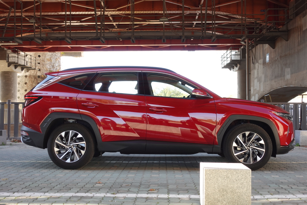 이번 투싼의 측면 디자인에서 놀라운 점은 2가지가 있습니다. 먼저 사이드 캐릭터 라인입니다. 전면 그릴인 파라메트릭 쥬얼 패턴 그릴을 연상하게끔 프런트 펜더에서 도어를 거쳐 리어 펜더까지 여러 방향으로 각진 디잔인은 해외 유명 자동차 브랜드에서도 찾아보기 힘든 부분입니다. 사실 이런 디자인은 단순히 스케치로만 이루어지는 것이 아닙니다. 철판을 자유자재로 만드는 것이 기술인데 전 세계 자동차 회사 중 철강회사를 함께 가지고 있는 회사는 현대자동차 밖에 없으며 현대자동차는 현대제철과 포스코에서 납품받아 디자인과 철강 기술력을 접목시켜 이런 디자인을 보여줍니다. 또 하나 놀라운 부분은 바로 휀더의 각진 휠 아치입니다. 보통의 둥근 형태의 휠 아치를 그리지만 이번 모델은 공격적인 모습의 휠 아치 형태를 보여주고 있어 람보르기니 SUV 우르스와 같이 강렬한 사이드 디자인을 보여주고 있습니다.