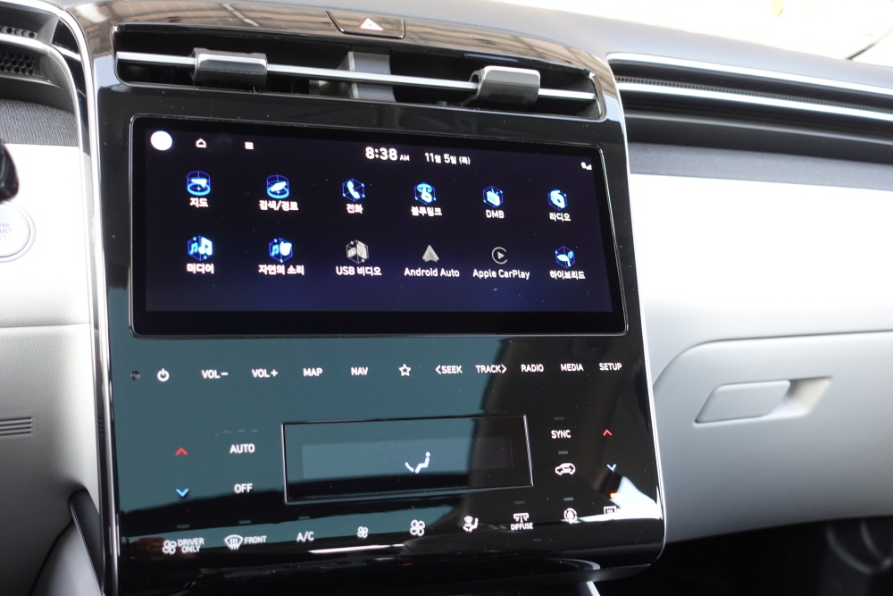 10.25인치 인포테인먼트 시스템은 가로 형태로 꽤 넓은 크기를 보여주고 있으며 다양한 인포테인먼트 시스템 버튼이나 공조기 버튼은 하나의 모니터와 같은 착각을 주는 만큼 디자인이 되어 있습니다. 하이그로시 재질을 사용하고 있어 지문이 좀 남는 것이 단점이지만 장점으로는 실내가 넓어 보이고 화려한 느낌을 보여주기에 충분합니다.