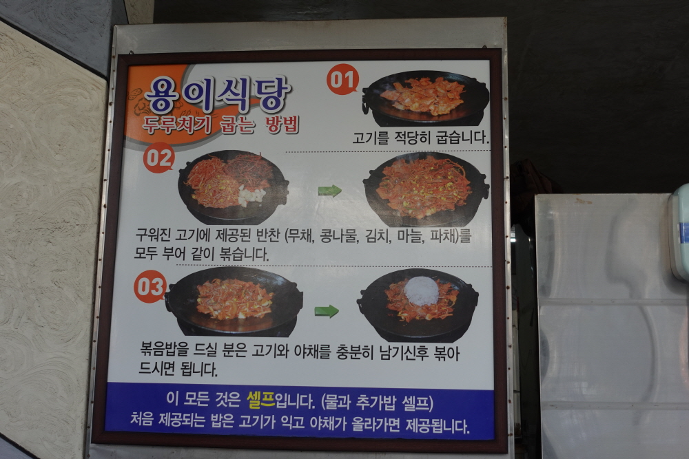용이식당은 생각보다 재미있는 곳이다. 고기를 적당히 굽고 구워진 고기에 제공된 반찬을 넣고 볶아주다 밥과 함께 먹다가 밥을 넣고 볶아주면 된다. 메뉴도 단일 메뉴로 1인분에 7천 원정도였고 이 곳에는 1인분에 5천원 일때부터 다녔다. 오랜만에 와서 그런지 그냥 처음부터 밥을 볶고 싶어져서 밥을 넣었는데 이때부터 문제였다. 이 곳을 처음 온 것도 아니고 수 년간에 왔고 셀프라는 것을 잘 알았지만 갑자기 식당에서 일하시는 분이 뭐하는거냐며 한국말도 제대로 안되는 사람이 화를 내는 것이다. 정겹게 뭐하는거냐도 아니고 한국말도 잘 못하는 사람이 처음부터 제대로 설명도 안하고 화를 내고 인상을 쓰고 있으니 식사 전부터 기분 좋을 이유가 없었다.