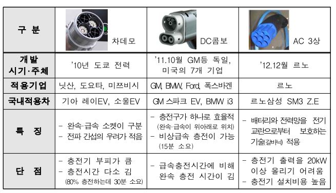 2010년 일본의 도쿄 전력에서 개발한 차데모는 닛산, 도요타, 미쯔비시의 일본 자동차 브랜드에서 채택했으며 초기에는 기아자동차의 레이 EV / 소울 EV 모델에서도 채택되었다. 1년 뒤엔 2011년 10월에 개발된 DC 콤보는 미국과 독일 자동차 브랜드에서 주로 채택하고 있는데 미국 자동차 공학회에서 DC 콤보 방식을 표준으로 채택하고 있으며 유럽 자동차 브랜드 또한 2019년부터 DC 콤보를 단일 표준으로 적용하는 법안을 채택하여 향후 앞으로 차데모 / AC 3상의 입지는 점차적으로 사용되지 않는 분위기 이며 국내 또한 DC 콤보를 주력으로 사용하고 있다.
