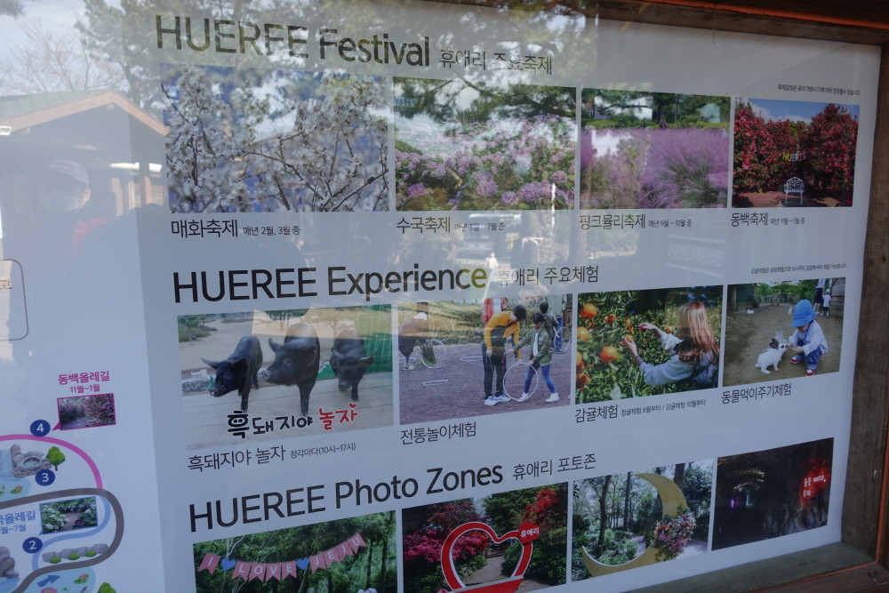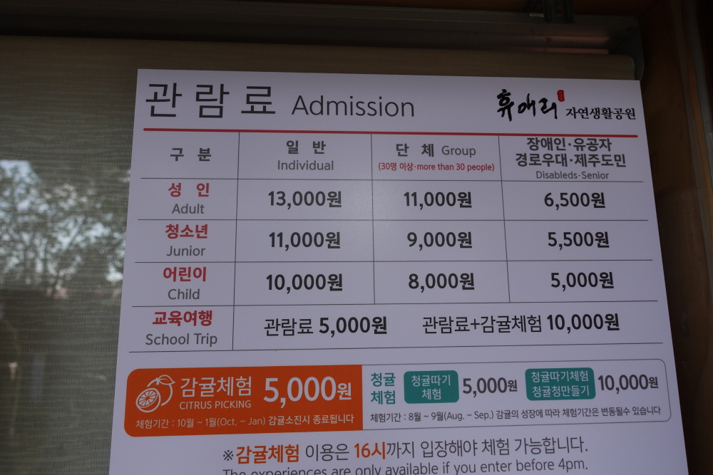 휴애리자연생활공원은 1인 1만 3천 원이라는 다소 높은 입장료를 가지고 있다. 하지만 단순히 동백꽃이 아닌 가족 테마파크처럼 구성되어 있기에 아주 비싼 금액은 아니며 청귤따기 체험 / 감귤체험 등 다양한 체험활동을 할 수 있기 때문에 제주도에서 경험할 수 있는 흑돼지, 감귤, 동백꽃을 한 번에 느낄 수가 있다.
