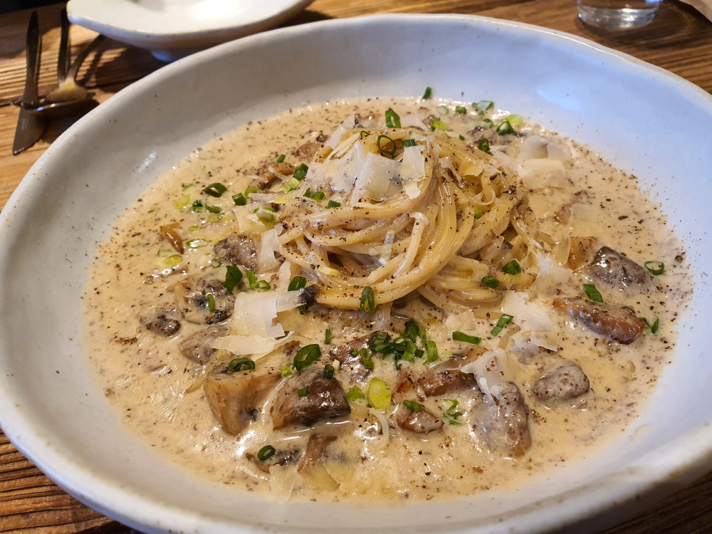 사실 다양한 메뉴를 한 번에 시켜놓고 싶을 정도로 향과 첫 느낌은 굉장히 좋았다. 특히나 용인 파스타 맛집으로 유명한 재재당에서 만든 파스타는 크림 파스타라 느끼할듯하지만 실제 맛을 보면 굉장히 부드럽고 느끼지하지 않으며 버섯의 향이 굉장히 진하게 어울리는 그런 맛을 가지고 있으며 누가 먹던 굉장히 만족스러운 맛이다.