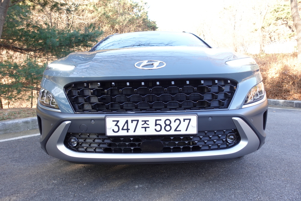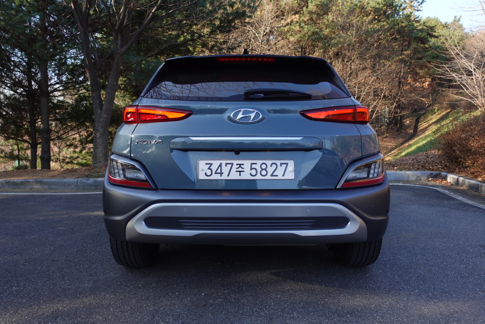 부분변경된 모델의 코나 하이브리드 모델에는 어디에서도 하이브리드라는 부분을 찾을 수가 없다. 기존 모델에서는 리어 트렁크에 Hybrid 엠블럼과 프론트 휀더에 BLUE DRIVE 엠블럼이 적용했지만 이 마저도 부분변경 모델에서 찾아볼 수 없어서 외관상으로는 하이브리드 모델인이 아닌지 알 수 없어 조금 더 비싼 모델을 구입해도 차량 외관에서 티나는 부분이 없는 점이 아쉽다.
