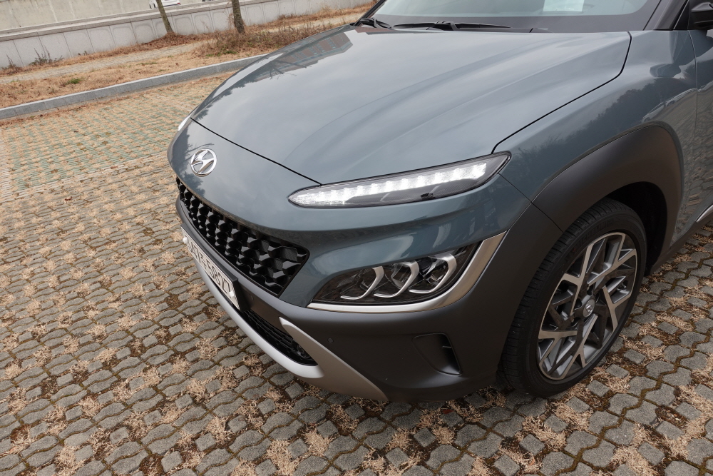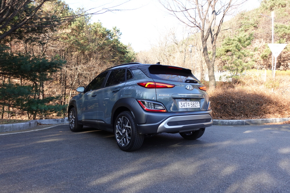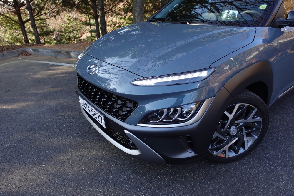부분변경된 모델의 코나 하이브리드 모델에는 어디에서도 하이브리드라는 부분을 찾을 수가 없다. 기존 모델에서는 리어 트렁크에 Hybrid 엠블럼과 프론트 휀더에 BLUE DRIVE 엠블럼이 적용했지만 이 마저도 부분변경 모델에서 찾아볼 수 없어서 외관상으로는 하이브리드 모델인이 아닌지 알 수 없어 조금 더 비싼 모델을 구입해도 차량 외관에서 티나는 부분이 없는 점이 아쉽다.