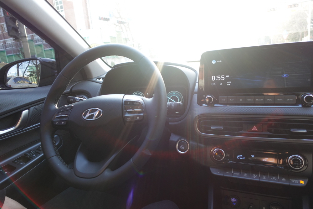 코나 하이브리드에는 10.25인치 인포테인먼트 시스템이 적용되는데 이 부분은 이전 부분변경 전부터 적용된 부분으로 실내 인테리어를 완성시켜준다. 여기에 반광 크롬 느낌의 가니쉬와 엠비언트 라이트 컵홀더 등이 기존 코나보다 좀 더 고급스럽게 만들어줬다.