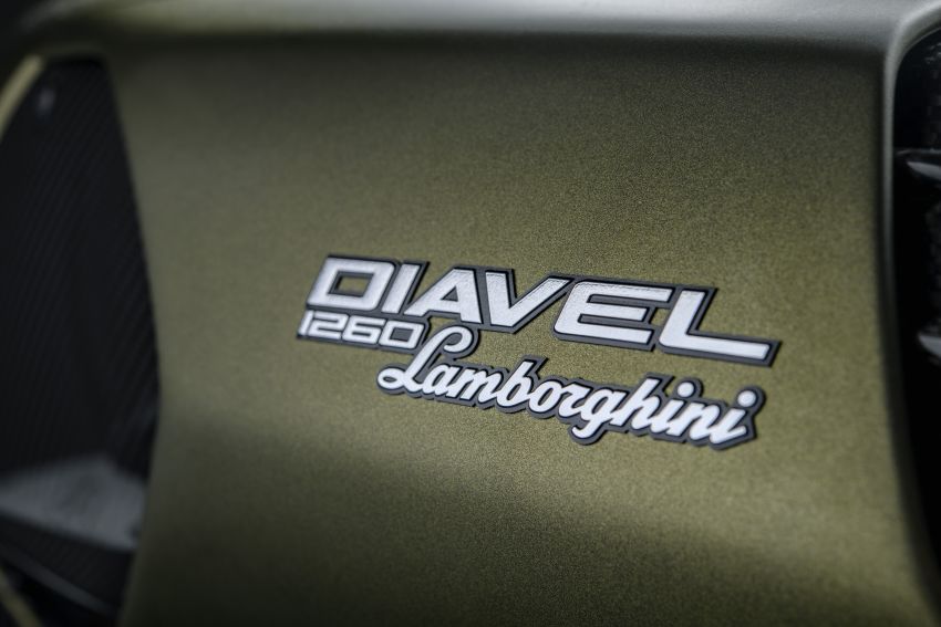 두카티 뉴 디아벨 1260 람보르기니 모델은 람보르기니 로고를 곳곳에 적용했으며 시안에 사용된 카본 소재를 꽤 많인 곳에 적용했다. 특히나 바이크의 모델의 무게를 줄이기 위하여 연료 탱크와 시트커버, 에어 인테이크와 스포일러, 라디에이터, 에어 인테이크까지 꽤 많은 부분에 카본 소재가 적용되었다.