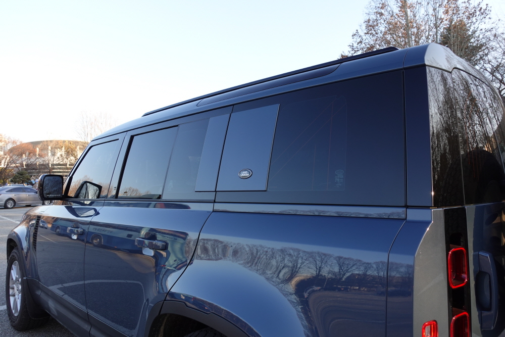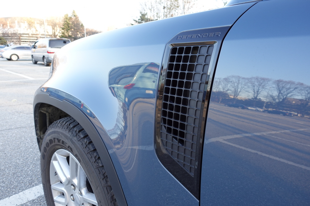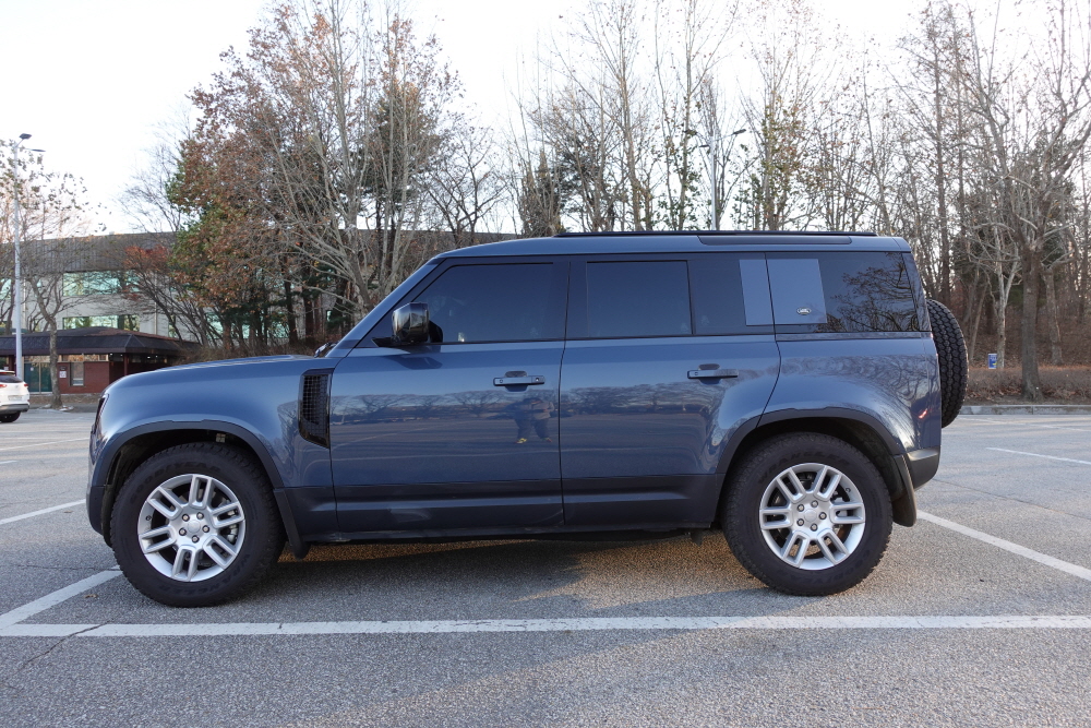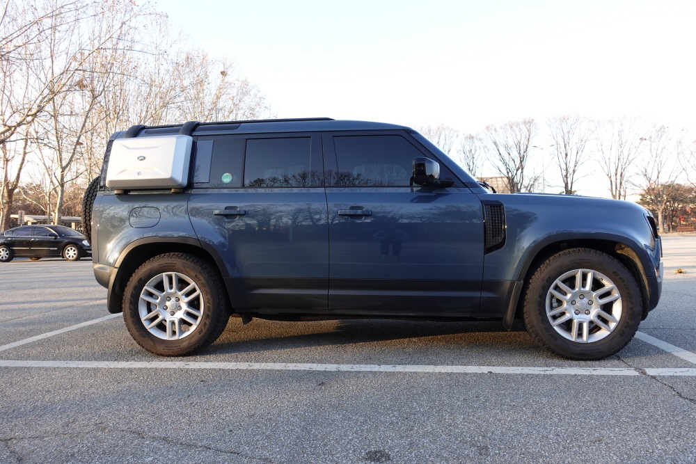 랜드로버 측면 디자인을 살펴보면 굉장히 단단한 느낌을 보여주고 있다. 랜드로버가 재규어를 인수한 이후에 출시된 차량은 옛날에 내가 알던 강인함의 랜드로버에 느낌이 많이 없고 어떻게든 고급스럽고 예뻐보이려고 노력한 흔적들이 많이 보인다. 하지만 디펜더는 예전의 1990년대 디자인을 오마주한 형태로 아이덴티티를 어떻게든 살리려고 노력하고 있다. 이 뿐만이 아니다. 디펜더라는 이름이 생기기 전 불리웠던 랜드로버 90 / 110 이라는 이름은 이제는 디펜더의 숏바디와 롱바디를 나뉘는 이름으로 본 시승차는 랜드로더 디펜더 110 모델로 3열 및 5+2 시트 옵션을 사용할 수 있는 모델이다.