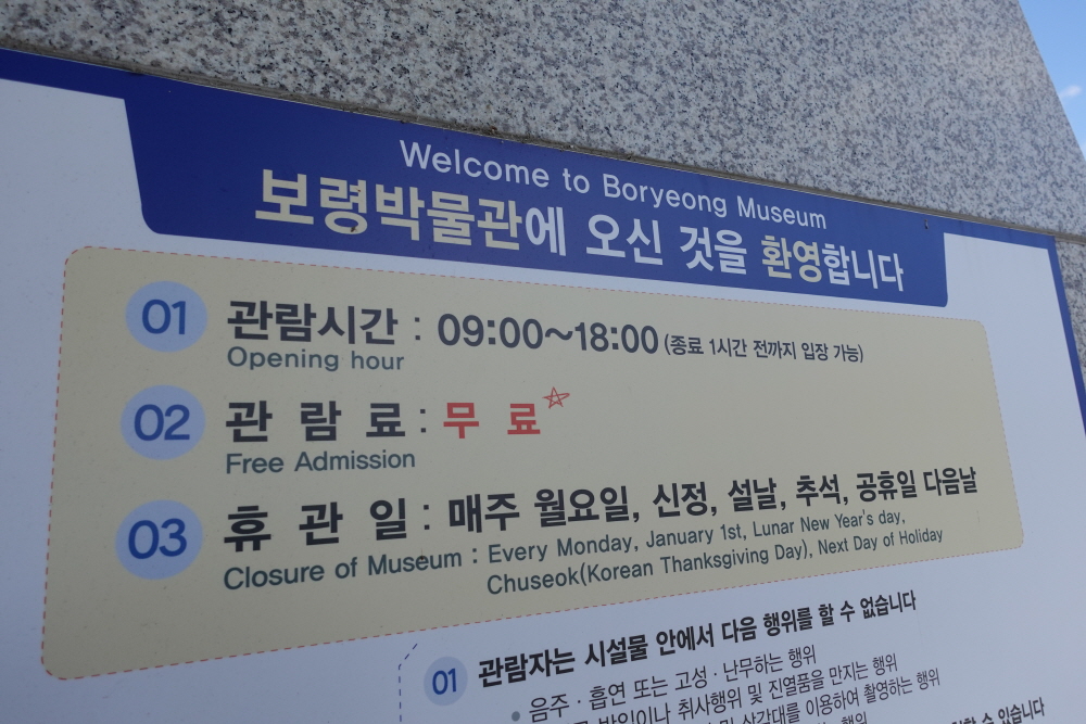 아이와 함께 가볼만한곳으로 보령 박물관에 방문한다면 관람시간 오전 9시부터 오후 18시까지 지켜야하며 관람료는 무료이다. 휴관일은 매주 월요일이며 신정과 설날 그리고 추서고가 공휴일 다음날은 휴무이기 때문에 꼭 확인을 해야한다.